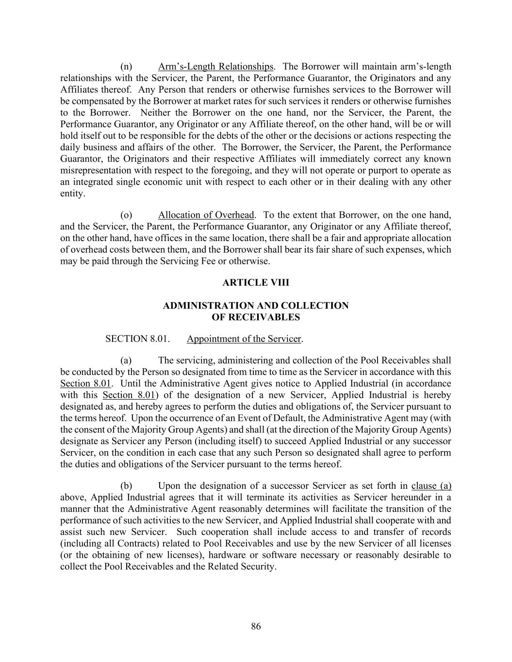 86 (n) Arm’s-Length Relationships. The Borrower will maintain arm’s-length relationships with the Servicer, the Parent, the Performance Guarantor, the Originators and any Affiliates thereof. Any Person that renders or otherwise furnishes services to the Borrower will be compensated by the Borrower at market rates for such services it renders or otherwise furnishes to the Borrower. Neither the Borrower on the one hand, nor the Servicer, the Parent, the Performance Guarantor, any Originator or any Affiliate thereof, on the other hand, will be or will hold itself out to be responsible for the debts of the other or the decisions or actions respecting the daily business and affairs of the other. The Borrower, the Servicer, the Parent, the Performance Guarantor, the Originators and their respective Affiliates will immediately correct any known misrepresentation with respect to the foregoing, and they will not operate or purport to operate as an integrated single economic unit with respect to each other or in their dealing with any other entity. (o) Allocation of Overhead. To the extent that Borrower, on the one hand, and the Servicer, the Parent, the Performance Guarantor, any Originator or any Affiliate thereof, on the other hand, have offices in the same location, there shall be a fair and appropriate allocation of overhead costs between them, and the Borrower shall bear its fair share of such expenses, which may be paid through the Servicing Fee or otherwise. ARTICLE VIII ADMINISTRATION AND COLLECTION OF RECEIVABLES SECTION 8.01. Appointment of the Servicer. (a) The servicing, administering and collection of the Pool Receivables shall be conducted by the Person so designated from time to time as the Servicer in accordance with this Section 8.01. Until the Administrative Agent gives notice to Applied Industrial (in accordance with this Section 8.01) of the designation of a new Servicer, Applied Industrial is hereby designated as, and hereby agrees to perform the duties and obligations of, the Servicer pursuant to the terms hereof. Upon the occurrence of an Event of Default, the Administrative Agent may (with the consent of the Majority Group Agents) and shall (at the direction of the Majority Group Agents) designate as Servicer any Person (including itself) to succeed Applied Industrial or any successor Servicer, on the condition in each case that any such Person so designated shall agree to perform the duties and obligations of the Servicer pursuant to the terms hereof. (b) Upon the designation of a successor Servicer as set forth in clause (a) above, Applied Industrial agrees that it will terminate its activities as Servicer hereunder in a manner that the Administrative Agent reasonably determines will facilitate the transition of the performance of such activities to the new Servicer, and Applied Industrial shall cooperate with and assist such new Servicer. Such cooperation shall include access to and transfer of records (including all Contracts) related to Pool Receivables and use by the new Servicer of all licenses (or the obtaining of new licenses), hardware or software necessary or reasonably desirable to collect the Pool Receivables and the Related Security.