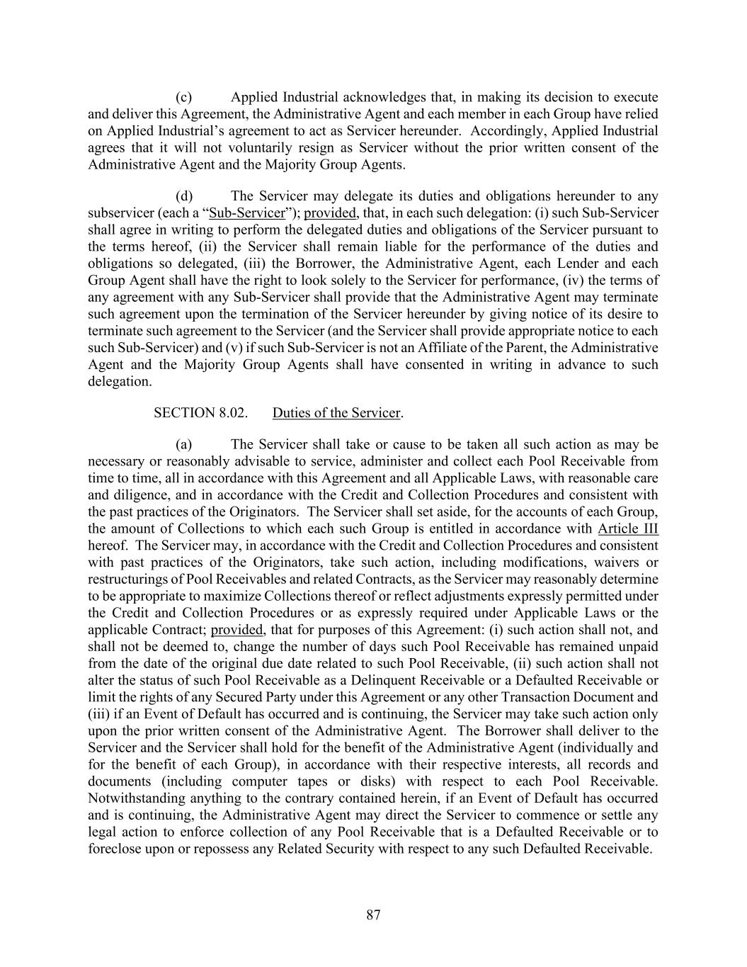 87 (c) Applied Industrial acknowledges that, in making its decision to execute and deliver this Agreement, the Administrative Agent and each member in each Group have relied on Applied Industrial’s agreement to act as Servicer hereunder. Accordingly, Applied Industrial agrees that it will not voluntarily resign as Servicer without the prior written consent of the Administrative Agent and the Majority Group Agents. (d) The Servicer may delegate its duties and obligations hereunder to any subservicer (each a “Sub-Servicer”); provided, that, in each such delegation: (i) such Sub-Servicer shall agree in writing to perform the delegated duties and obligations of the Servicer pursuant to the terms hereof, (ii) the Servicer shall remain liable for the performance of the duties and obligations so delegated, (iii) the Borrower, the Administrative Agent, each Lender and each Group Agent shall have the right to look solely to the Servicer for performance, (iv) the terms of any agreement with any Sub-Servicer shall provide that the Administrative Agent may terminate such agreement upon the termination of the Servicer hereunder by giving notice of its desire to terminate such agreement to the Servicer (and the Servicer shall provide appropriate notice to each such Sub-Servicer) and (v) if such Sub-Servicer is not an Affiliate of the Parent, the Administrative Agent and the Majority Group Agents shall have consented in writing in advance to such delegation. SECTION 8.02. Duties of the Servicer. (a) The Servicer shall take or cause to be taken all such action as may be necessary or reasonably advisable to service, administer and collect each Pool Receivable from time to time, all in accordance with this Agreement and all Applicable Laws, with reasonable care and diligence, and in accordance with the Credit and Collection Procedures and consistent with the past practices of the Originators. The Servicer shall set aside, for the accounts of each Group, the amount of Collections to which each such Group is entitled in accordance with Article III hereof. The Servicer may, in accordance with the Credit and Collection Procedures and consistent with past practices of the Originators, take such action, including modifications, waivers or restructurings of Pool Receivables and related Contracts, as the Servicer may reasonably determine to be appropriate to maximize Collections thereof or reflect adjustments expressly permitted under the Credit and Collection Procedures or as expressly required under Applicable Laws or the applicable Contract; provided, that for purposes of this Agreement: (i) such action shall not, and shall not be deemed to, change the number of days such Pool Receivable has remained unpaid from the date of the original due date related to such Pool Receivable, (ii) such action shall not alter the status of such Pool Receivable as a Delinquent Receivable or a Defaulted Receivable or limit the rights of any Secured Party under this Agreement or any other Transaction Document and (iii) if an Event of Default has occurred and is continuing, the Servicer may take such action only upon the prior written consent of the Administrative Agent. The Borrower shall deliver to the Servicer and the Servicer shall hold for the benefit of the Administrative Agent (individually and for the benefit of each Group), in accordance with their respective interests, all records and documents (including computer tapes or disks) with respect to each Pool Receivable. Notwithstanding anything to the contrary contained herein, if an Event of Default has occurred and is continuing, the Administrative Agent may direct the Servicer to commence or settle any legal action to enforce collection of any Pool Receivable that is a Defaulted Receivable or to foreclose upon or repossess any Related Security with respect to any such Defaulted Receivable.