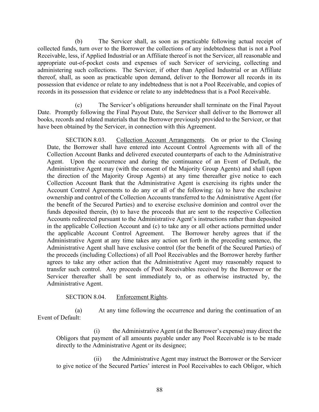 88 (b) The Servicer shall, as soon as practicable following actual receipt of collected funds, turn over to the Borrower the collections of any indebtedness that is not a Pool Receivable, less, if Applied Industrial or an Affiliate thereof is not the Servicer, all reasonable and appropriate out-of-pocket costs and expenses of such Servicer of servicing, collecting and administering such collections. The Servicer, if other than Applied Industrial or an Affiliate thereof, shall, as soon as practicable upon demand, deliver to the Borrower all records in its possession that evidence or relate to any indebtedness that is not a Pool Receivable, and copies of records in its possession that evidence or relate to any indebtedness that is a Pool Receivable. (c) The Servicer’s obligations hereunder shall terminate on the Final Payout Date. Promptly following the Final Payout Date, the Servicer shall deliver to the Borrower all books, records and related materials that the Borrower previously provided to the Servicer, or that have been obtained by the Servicer, in connection with this Agreement. SECTION 8.03. Collection Account Arrangements. On or prior to the Closing Date, the Borrower shall have entered into Account Control Agreements with all of the Collection Account Banks and delivered executed counterparts of each to the Administrative Agent. Upon the occurrence and during the continuance of an Event of Default, the Administrative Agent may (with the consent of the Majority Group Agents) and shall (upon the direction of the Majority Group Agents) at any time thereafter give notice to each Collection Account Bank that the Administrative Agent is exercising its rights under the Account Control Agreements to do any or all of the following: (a) to have the exclusive ownership and control of the Collection Accounts transferred to the Administrative Agent (for the benefit of the Secured Parties) and to exercise exclusive dominion and control over the funds deposited therein, (b) to have the proceeds that are sent to the respective Collection Accounts redirected pursuant to the Administrative Agent’s instructions rather than deposited in the applicable Collection Account and (c) to take any or all other actions permitted under the applicable Account Control Agreement. The Borrower hereby agrees that if the Administrative Agent at any time takes any action set forth in the preceding sentence, the Administrative Agent shall have exclusive control (for the benefit of the Secured Parties) of the proceeds (including Collections) of all Pool Receivables and the Borrower hereby further agrees to take any other action that the Administrative Agent may reasonably request to transfer such control. Any proceeds of Pool Receivables received by the Borrower or the Servicer thereafter shall be sent immediately to, or as otherwise instructed by, the Administrative Agent. SECTION 8.04. Enforcement Rights. (a) At any time following the occurrence and during the continuation of an Event of Default: (i) the Administrative Agent (at the Borrower’s expense) may direct the Obligors that payment of all amounts payable under any Pool Receivable is to be made directly to the Administrative Agent or its designee; (ii) the Administrative Agent may instruct the Borrower or the Servicer to give notice of the Secured Parties’ interest in Pool Receivables to each Obligor, which