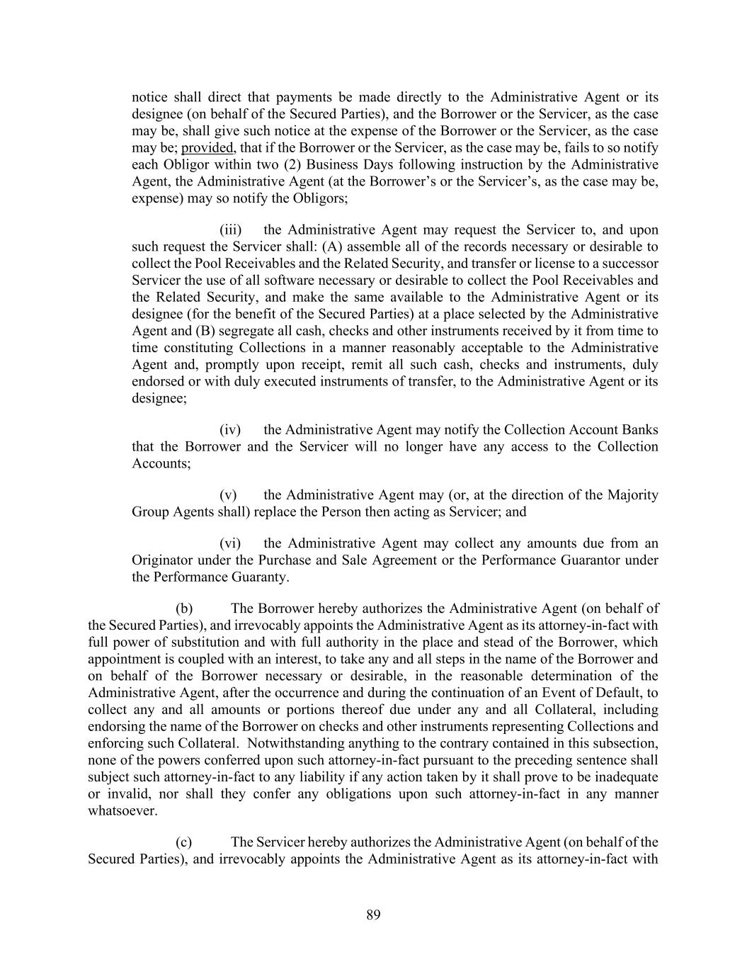 89 notice shall direct that payments be made directly to the Administrative Agent or its designee (on behalf of the Secured Parties), and the Borrower or the Servicer, as the case may be, shall give such notice at the expense of the Borrower or the Servicer, as the case may be; provided, that if the Borrower or the Servicer, as the case may be, fails to so notify each Obligor within two (2) Business Days following instruction by the Administrative Agent, the Administrative Agent (at the Borrower’s or the Servicer’s, as the case may be, expense) may so notify the Obligors; (iii) the Administrative Agent may request the Servicer to, and upon such request the Servicer shall: (A) assemble all of the records necessary or desirable to collect the Pool Receivables and the Related Security, and transfer or license to a successor Servicer the use of all software necessary or desirable to collect the Pool Receivables and the Related Security, and make the same available to the Administrative Agent or its designee (for the benefit of the Secured Parties) at a place selected by the Administrative Agent and (B) segregate all cash, checks and other instruments received by it from time to time constituting Collections in a manner reasonably acceptable to the Administrative Agent and, promptly upon receipt, remit all such cash, checks and instruments, duly endorsed or with duly executed instruments of transfer, to the Administrative Agent or its designee; (iv) the Administrative Agent may notify the Collection Account Banks that the Borrower and the Servicer will no longer have any access to the Collection Accounts; (v) the Administrative Agent may (or, at the direction of the Majority Group Agents shall) replace the Person then acting as Servicer; and (vi) the Administrative Agent may collect any amounts due from an Originator under the Purchase and Sale Agreement or the Performance Guarantor under the Performance Guaranty. (b) The Borrower hereby authorizes the Administrative Agent (on behalf of the Secured Parties), and irrevocably appoints the Administrative Agent as its attorney-in-fact with full power of substitution and with full authority in the place and stead of the Borrower, which appointment is coupled with an interest, to take any and all steps in the name of the Borrower and on behalf of the Borrower necessary or desirable, in the reasonable determination of the Administrative Agent, after the occurrence and during the continuation of an Event of Default, to collect any and all amounts or portions thereof due under any and all Collateral, including endorsing the name of the Borrower on checks and other instruments representing Collections and enforcing such Collateral. Notwithstanding anything to the contrary contained in this subsection, none of the powers conferred upon such attorney-in-fact pursuant to the preceding sentence shall subject such attorney-in-fact to any liability if any action taken by it shall prove to be inadequate or invalid, nor shall they confer any obligations upon such attorney-in-fact in any manner whatsoever. (c) The Servicer hereby authorizes the Administrative Agent (on behalf of the Secured Parties), and irrevocably appoints the Administrative Agent as its attorney-in-fact with
