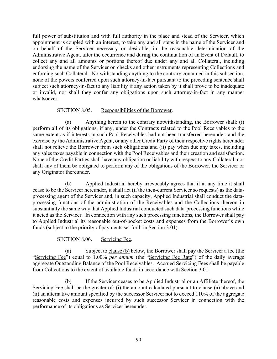 90 full power of substitution and with full authority in the place and stead of the Servicer, which appointment is coupled with an interest, to take any and all steps in the name of the Servicer and on behalf of the Servicer necessary or desirable, in the reasonable determination of the Administrative Agent, after the occurrence and during the continuation of an Event of Default, to collect any and all amounts or portions thereof due under any and all Collateral, including endorsing the name of the Servicer on checks and other instruments representing Collections and enforcing such Collateral. Notwithstanding anything to the contrary contained in this subsection, none of the powers conferred upon such attorney-in-fact pursuant to the preceding sentence shall subject such attorney-in-fact to any liability if any action taken by it shall prove to be inadequate or invalid, nor shall they confer any obligations upon such attorney-in-fact in any manner whatsoever. SECTION 8.05. Responsibilities of the Borrower. (a) Anything herein to the contrary notwithstanding, the Borrower shall: (i) perform all of its obligations, if any, under the Contracts related to the Pool Receivables to the same extent as if interests in such Pool Receivables had not been transferred hereunder, and the exercise by the Administrative Agent, or any other Credit Party of their respective rights hereunder shall not relieve the Borrower from such obligations and (ii) pay when due any taxes, including any sales taxes payable in connection with the Pool Receivables and their creation and satisfaction. None of the Credit Parties shall have any obligation or liability with respect to any Collateral, nor shall any of them be obligated to perform any of the obligations of the Borrower, the Servicer or any Originator thereunder. (b) Applied Industrial hereby irrevocably agrees that if at any time it shall cease to be the Servicer hereunder, it shall act (if the then-current Servicer so requests) as the data- processing agent of the Servicer and, in such capacity, Applied Industrial shall conduct the data- processing functions of the administration of the Receivables and the Collections thereon in substantially the same way that Applied Industrial conducted such data-processing functions while it acted as the Servicer. In connection with any such processing functions, the Borrower shall pay to Applied Industrial its reasonable out-of-pocket costs and expenses from the Borrower’s own funds (subject to the priority of payments set forth in Section 3.01). SECTION 8.06. Servicing Fee. (a) Subject to clause (b) below, the Borrower shall pay the Servicer a fee (the “Servicing Fee”) equal to 1.00% per annum (the “Servicing Fee Rate”) of the daily average aggregate Outstanding Balance of the Pool Receivables. Accrued Servicing Fees shall be payable from Collections to the extent of available funds in accordance with Section 3.01. (b) If the Servicer ceases to be Applied Industrial or an Affiliate thereof, the Servicing Fee shall be the greater of: (i) the amount calculated pursuant to clause (a) above and (ii) an alternative amount specified by the successor Servicer not to exceed 110% of the aggregate reasonable costs and expenses incurred by such successor Servicer in connection with the performance of its obligations as Servicer hereunder.