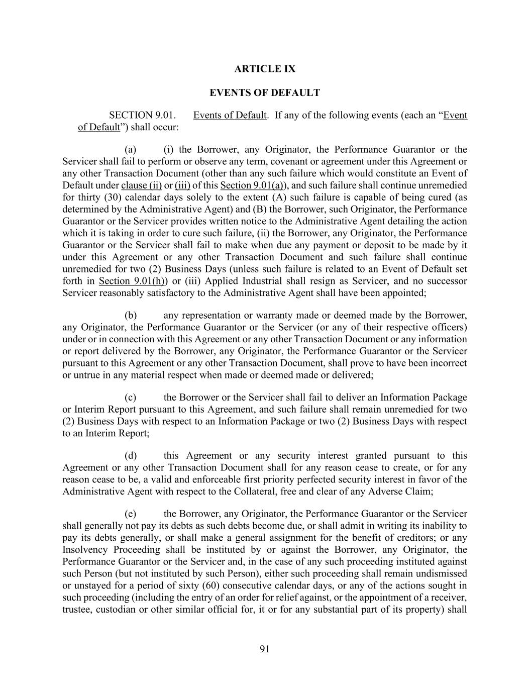 91 ARTICLE IX EVENTS OF DEFAULT SECTION 9.01. Events of Default. If any of the following events (each an “Event of Default”) shall occur: (a) (i) the Borrower, any Originator, the Performance Guarantor or the Servicer shall fail to perform or observe any term, covenant or agreement under this Agreement or any other Transaction Document (other than any such failure which would constitute an Event of Default under clause (ii) or (iii) of this Section 9.01(a)), and such failure shall continue unremedied for thirty (30) calendar days solely to the extent (A) such failure is capable of being cured (as determined by the Administrative Agent) and (B) the Borrower, such Originator, the Performance Guarantor or the Servicer provides written notice to the Administrative Agent detailing the action which it is taking in order to cure such failure, (ii) the Borrower, any Originator, the Performance Guarantor or the Servicer shall fail to make when due any payment or deposit to be made by it under this Agreement or any other Transaction Document and such failure shall continue unremedied for two (2) Business Days (unless such failure is related to an Event of Default set forth in Section 9.01(h)) or (iii) Applied Industrial shall resign as Servicer, and no successor Servicer reasonably satisfactory to the Administrative Agent shall have been appointed; (b) any representation or warranty made or deemed made by the Borrower, any Originator, the Performance Guarantor or the Servicer (or any of their respective officers) under or in connection with this Agreement or any other Transaction Document or any information or report delivered by the Borrower, any Originator, the Performance Guarantor or the Servicer pursuant to this Agreement or any other Transaction Document, shall prove to have been incorrect or untrue in any material respect when made or deemed made or delivered; (c) the Borrower or the Servicer shall fail to deliver an Information Package or Interim Report pursuant to this Agreement, and such failure shall remain unremedied for two (2) Business Days with respect to an Information Package or two (2) Business Days with respect to an Interim Report; (d) this Agreement or any security interest granted pursuant to this Agreement or any other Transaction Document shall for any reason cease to create, or for any reason cease to be, a valid and enforceable first priority perfected security interest in favor of the Administrative Agent with respect to the Collateral, free and clear of any Adverse Claim; (e) the Borrower, any Originator, the Performance Guarantor or the Servicer shall generally not pay its debts as such debts become due, or shall admit in writing its inability to pay its debts generally, or shall make a general assignment for the benefit of creditors; or any Insolvency Proceeding shall be instituted by or against the Borrower, any Originator, the Performance Guarantor or the Servicer and, in the case of any such proceeding instituted against such Person (but not instituted by such Person), either such proceeding shall remain undismissed or unstayed for a period of sixty (60) consecutive calendar days, or any of the actions sought in such proceeding (including the entry of an order for relief against, or the appointment of a receiver, trustee, custodian or other similar official for, it or for any substantial part of its property) shall