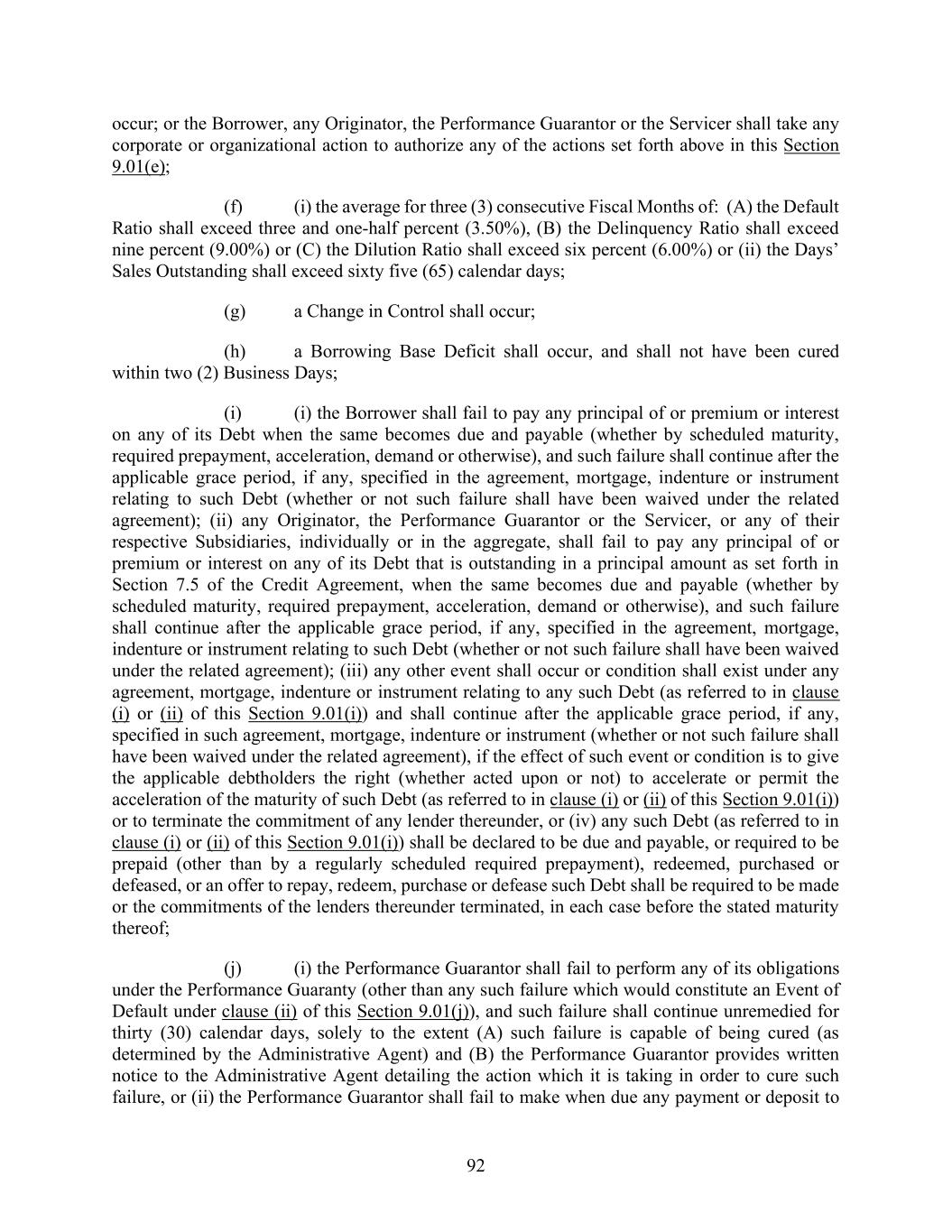 92 occur; or the Borrower, any Originator, the Performance Guarantor or the Servicer shall take any corporate or organizational action to authorize any of the actions set forth above in this Section 9.01(e); (f) (i) the average for three (3) consecutive Fiscal Months of: (A) the Default Ratio shall exceed three and one-half percent (3.50%), (B) the Delinquency Ratio shall exceed nine percent (9.00%) or (C) the Dilution Ratio shall exceed six percent (6.00%) or (ii) the Days’ Sales Outstanding shall exceed sixty five (65) calendar days; (g) a Change in Control shall occur; (h) a Borrowing Base Deficit shall occur, and shall not have been cured within two (2) Business Days; (i) (i) the Borrower shall fail to pay any principal of or premium or interest on any of its Debt when the same becomes due and payable (whether by scheduled maturity, required prepayment, acceleration, demand or otherwise), and such failure shall continue after the applicable grace period, if any, specified in the agreement, mortgage, indenture or instrument relating to such Debt (whether or not such failure shall have been waived under the related agreement); (ii) any Originator, the Performance Guarantor or the Servicer, or any of their respective Subsidiaries, individually or in the aggregate, shall fail to pay any principal of or premium or interest on any of its Debt that is outstanding in a principal amount as set forth in Section 7.5 of the Credit Agreement, when the same becomes due and payable (whether by scheduled maturity, required prepayment, acceleration, demand or otherwise), and such failure shall continue after the applicable grace period, if any, specified in the agreement, mortgage, indenture or instrument relating to such Debt (whether or not such failure shall have been waived under the related agreement); (iii) any other event shall occur or condition shall exist under any agreement, mortgage, indenture or instrument relating to any such Debt (as referred to in clause (i) or (ii) of this Section 9.01(i)) and shall continue after the applicable grace period, if any, specified in such agreement, mortgage, indenture or instrument (whether or not such failure shall have been waived under the related agreement), if the effect of such event or condition is to give the applicable debtholders the right (whether acted upon or not) to accelerate or permit the acceleration of the maturity of such Debt (as referred to in clause (i) or (ii) of this Section 9.01(i)) or to terminate the commitment of any lender thereunder, or (iv) any such Debt (as referred to in clause (i) or (ii) of this Section 9.01(i)) shall be declared to be due and payable, or required to be prepaid (other than by a regularly scheduled required prepayment), redeemed, purchased or defeased, or an offer to repay, redeem, purchase or defease such Debt shall be required to be made or the commitments of the lenders thereunder terminated, in each case before the stated maturity thereof; (j) (i) the Performance Guarantor shall fail to perform any of its obligations under the Performance Guaranty (other than any such failure which would constitute an Event of Default under clause (ii) of this Section 9.01(j)), and such failure shall continue unremedied for thirty (30) calendar days, solely to the extent (A) such failure is capable of being cured (as determined by the Administrative Agent) and (B) the Performance Guarantor provides written notice to the Administrative Agent detailing the action which it is taking in order to cure such failure, or (ii) the Performance Guarantor shall fail to make when due any payment or deposit to