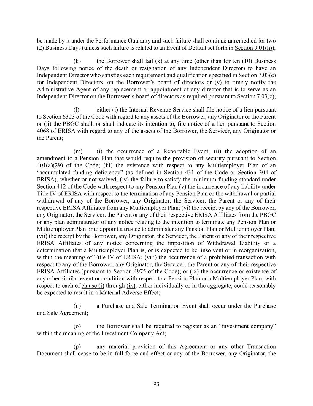 93 be made by it under the Performance Guaranty and such failure shall continue unremedied for two (2) Business Days (unless such failure is related to an Event of Default set forth in Section 9.01(h)); (k) the Borrower shall fail (x) at any time (other than for ten (10) Business Days following notice of the death or resignation of any Independent Director) to have an Independent Director who satisfies each requirement and qualification specified in Section 7.03(c) for Independent Directors, on the Borrower’s board of directors or (y) to timely notify the Administrative Agent of any replacement or appointment of any director that is to serve as an Independent Director on the Borrower’s board of directors as required pursuant to Section 7.03(c); (l) either (i) the Internal Revenue Service shall file notice of a lien pursuant to Section 6323 of the Code with regard to any assets of the Borrower, any Originator or the Parent or (ii) the PBGC shall, or shall indicate its intention to, file notice of a lien pursuant to Section 4068 of ERISA with regard to any of the assets of the Borrower, the Servicer, any Originator or the Parent; (m) (i) the occurrence of a Reportable Event; (ii) the adoption of an amendment to a Pension Plan that would require the provision of security pursuant to Section 401(a)(29) of the Code; (iii) the existence with respect to any Multiemployer Plan of an “accumulated funding deficiency” (as defined in Section 431 of the Code or Section 304 of ERISA), whether or not waived; (iv) the failure to satisfy the minimum funding standard under Section 412 of the Code with respect to any Pension Plan (v) the incurrence of any liability under Title IV of ERISA with respect to the termination of any Pension Plan or the withdrawal or partial withdrawal of any of the Borrower, any Originator, the Servicer, the Parent or any of their respective ERISA Affiliates from any Multiemployer Plan; (vi) the receipt by any of the Borrower, any Originator, the Servicer, the Parent or any of their respective ERISA Affiliates from the PBGC or any plan administrator of any notice relating to the intention to terminate any Pension Plan or Multiemployer Plan or to appoint a trustee to administer any Pension Plan or Multiemployer Plan; (vii) the receipt by the Borrower, any Originator, the Servicer, the Parent or any of their respective ERISA Affiliates of any notice concerning the imposition of Withdrawal Liability or a determination that a Multiemployer Plan is, or is expected to be, insolvent or in reorganization, within the meaning of Title IV of ERISA; (viii) the occurrence of a prohibited transaction with respect to any of the Borrower, any Originator, the Servicer, the Parent or any of their respective ERISA Affiliates (pursuant to Section 4975 of the Code); or (ix) the occurrence or existence of any other similar event or condition with respect to a Pension Plan or a Multiemployer Plan, with respect to each of clause (i) through (ix), either individually or in the aggregate, could reasonably be expected to result in a Material Adverse Effect; (n) a Purchase and Sale Termination Event shall occur under the Purchase and Sale Agreement; (o) the Borrower shall be required to register as an “investment company” within the meaning of the Investment Company Act; (p) any material provision of this Agreement or any other Transaction Document shall cease to be in full force and effect or any of the Borrower, any Originator, the