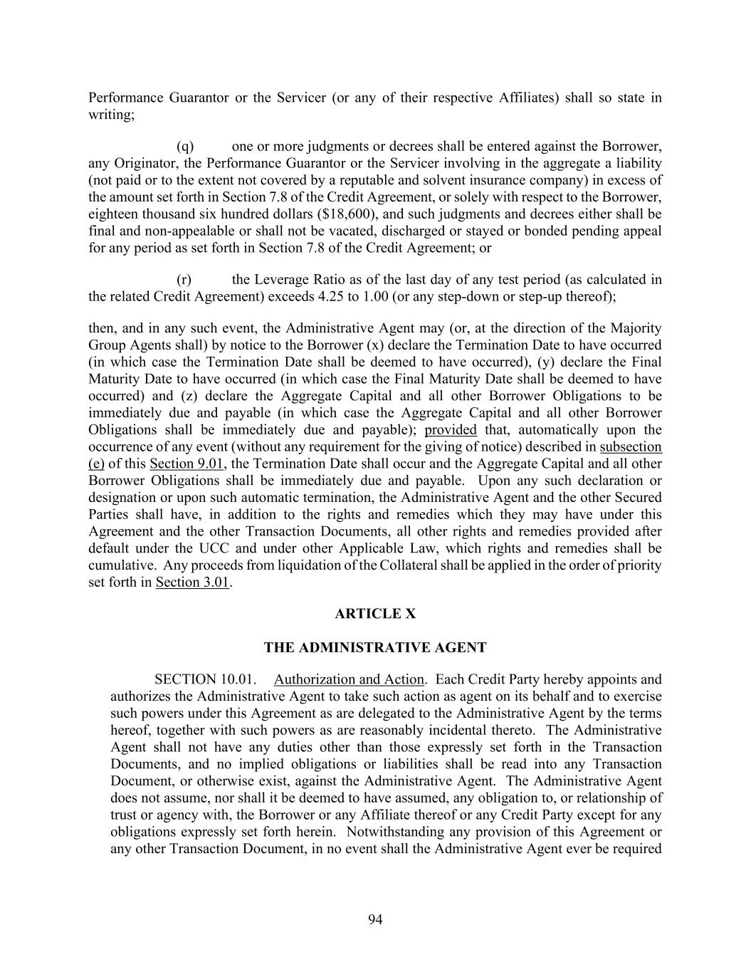 94 Performance Guarantor or the Servicer (or any of their respective Affiliates) shall so state in writing; (q) one or more judgments or decrees shall be entered against the Borrower, any Originator, the Performance Guarantor or the Servicer involving in the aggregate a liability (not paid or to the extent not covered by a reputable and solvent insurance company) in excess of the amount set forth in Section 7.8 of the Credit Agreement, or solely with respect to the Borrower, eighteen thousand six hundred dollars ($18,600), and such judgments and decrees either shall be final and non-appealable or shall not be vacated, discharged or stayed or bonded pending appeal for any period as set forth in Section 7.8 of the Credit Agreement; or (r) the Leverage Ratio as of the last day of any test period (as calculated in the related Credit Agreement) exceeds 4.25 to 1.00 (or any step-down or step-up thereof); then, and in any such event, the Administrative Agent may (or, at the direction of the Majority Group Agents shall) by notice to the Borrower (x) declare the Termination Date to have occurred (in which case the Termination Date shall be deemed to have occurred), (y) declare the Final Maturity Date to have occurred (in which case the Final Maturity Date shall be deemed to have occurred) and (z) declare the Aggregate Capital and all other Borrower Obligations to be immediately due and payable (in which case the Aggregate Capital and all other Borrower Obligations shall be immediately due and payable); provided that, automatically upon the occurrence of any event (without any requirement for the giving of notice) described in subsection (e) of this Section 9.01, the Termination Date shall occur and the Aggregate Capital and all other Borrower Obligations shall be immediately due and payable. Upon any such declaration or designation or upon such automatic termination, the Administrative Agent and the other Secured Parties shall have, in addition to the rights and remedies which they may have under this Agreement and the other Transaction Documents, all other rights and remedies provided after default under the UCC and under other Applicable Law, which rights and remedies shall be cumulative. Any proceeds from liquidation of the Collateral shall be applied in the order of priority set forth in Section 3.01. ARTICLE X THE ADMINISTRATIVE AGENT SECTION 10.01. Authorization and Action. Each Credit Party hereby appoints and authorizes the Administrative Agent to take such action as agent on its behalf and to exercise such powers under this Agreement as are delegated to the Administrative Agent by the terms hereof, together with such powers as are reasonably incidental thereto. The Administrative Agent shall not have any duties other than those expressly set forth in the Transaction Documents, and no implied obligations or liabilities shall be read into any Transaction Document, or otherwise exist, against the Administrative Agent. The Administrative Agent does not assume, nor shall it be deemed to have assumed, any obligation to, or relationship of trust or agency with, the Borrower or any Affiliate thereof or any Credit Party except for any obligations expressly set forth herein. Notwithstanding any provision of this Agreement or any other Transaction Document, in no event shall the Administrative Agent ever be required