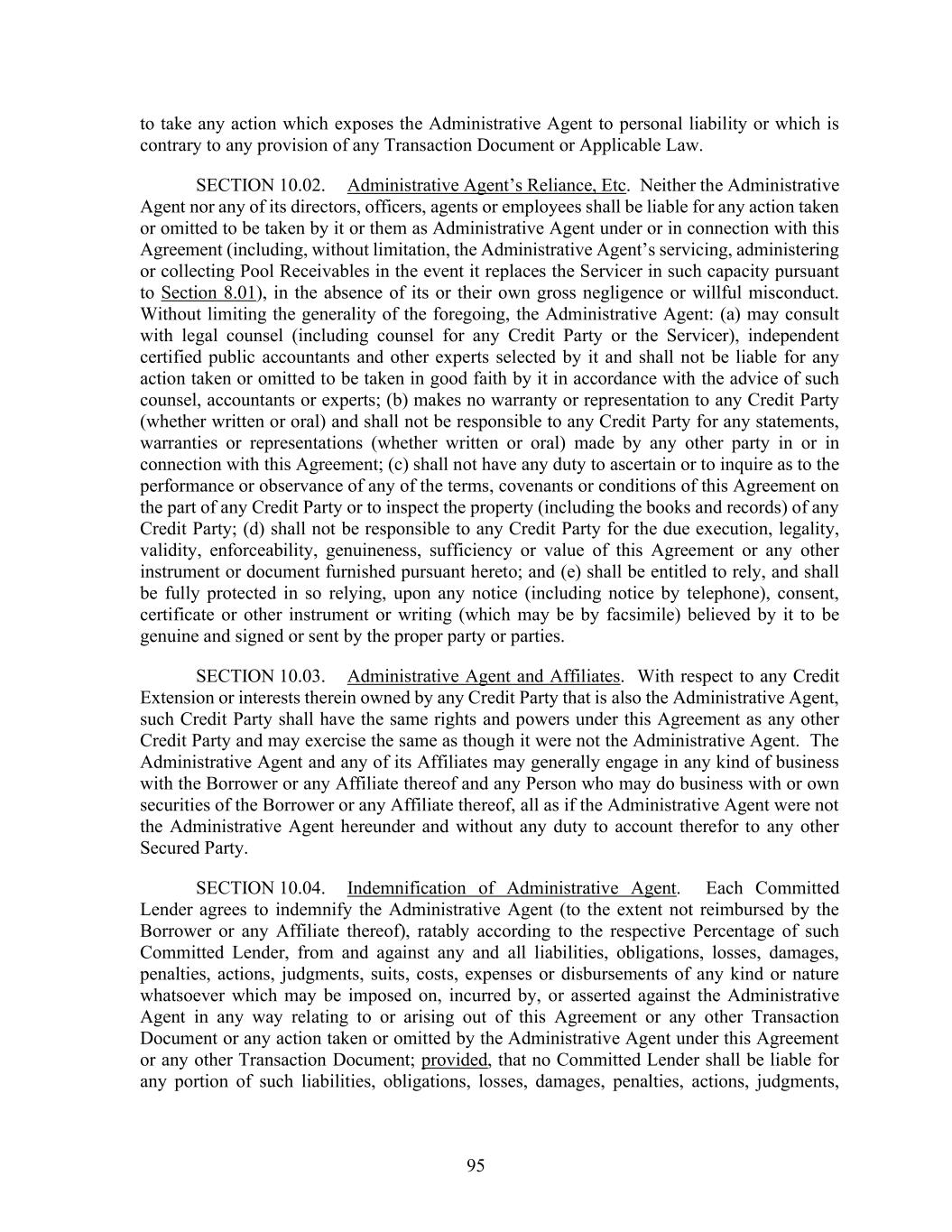95 to take any action which exposes the Administrative Agent to personal liability or which is contrary to any provision of any Transaction Document or Applicable Law. SECTION 10.02. Administrative Agent’s Reliance, Etc. Neither the Administrative Agent nor any of its directors, officers, agents or employees shall be liable for any action taken or omitted to be taken by it or them as Administrative Agent under or in connection with this Agreement (including, without limitation, the Administrative Agent’s servicing, administering or collecting Pool Receivables in the event it replaces the Servicer in such capacity pursuant to Section 8.01), in the absence of its or their own gross negligence or willful misconduct. Without limiting the generality of the foregoing, the Administrative Agent: (a) may consult with legal counsel (including counsel for any Credit Party or the Servicer), independent certified public accountants and other experts selected by it and shall not be liable for any action taken or omitted to be taken in good faith by it in accordance with the advice of such counsel, accountants or experts; (b) makes no warranty or representation to any Credit Party (whether written or oral) and shall not be responsible to any Credit Party for any statements, warranties or representations (whether written or oral) made by any other party in or in connection with this Agreement; (c) shall not have any duty to ascertain or to inquire as to the performance or observance of any of the terms, covenants or conditions of this Agreement on the part of any Credit Party or to inspect the property (including the books and records) of any Credit Party; (d) shall not be responsible to any Credit Party for the due execution, legality, validity, enforceability, genuineness, sufficiency or value of this Agreement or any other instrument or document furnished pursuant hereto; and (e) shall be entitled to rely, and shall be fully protected in so relying, upon any notice (including notice by telephone), consent, certificate or other instrument or writing (which may be by facsimile) believed by it to be genuine and signed or sent by the proper party or parties. SECTION 10.03. Administrative Agent and Affiliates. With respect to any Credit Extension or interests therein owned by any Credit Party that is also the Administrative Agent, such Credit Party shall have the same rights and powers under this Agreement as any other Credit Party and may exercise the same as though it were not the Administrative Agent. The Administrative Agent and any of its Affiliates may generally engage in any kind of business with the Borrower or any Affiliate thereof and any Person who may do business with or own securities of the Borrower or any Affiliate thereof, all as if the Administrative Agent were not the Administrative Agent hereunder and without any duty to account therefor to any other Secured Party. SECTION 10.04. Indemnification of Administrative Agent. Each Committed Lender agrees to indemnify the Administrative Agent (to the extent not reimbursed by the Borrower or any Affiliate thereof), ratably according to the respective Percentage of such Committed Lender, from and against any and all liabilities, obligations, losses, damages, penalties, actions, judgments, suits, costs, expenses or disbursements of any kind or nature whatsoever which may be imposed on, incurred by, or asserted against the Administrative Agent in any way relating to or arising out of this Agreement or any other Transaction Document or any action taken or omitted by the Administrative Agent under this Agreement or any other Transaction Document; provided, that no Committed Lender shall be liable for any portion of such liabilities, obligations, losses, damages, penalties, actions, judgments,