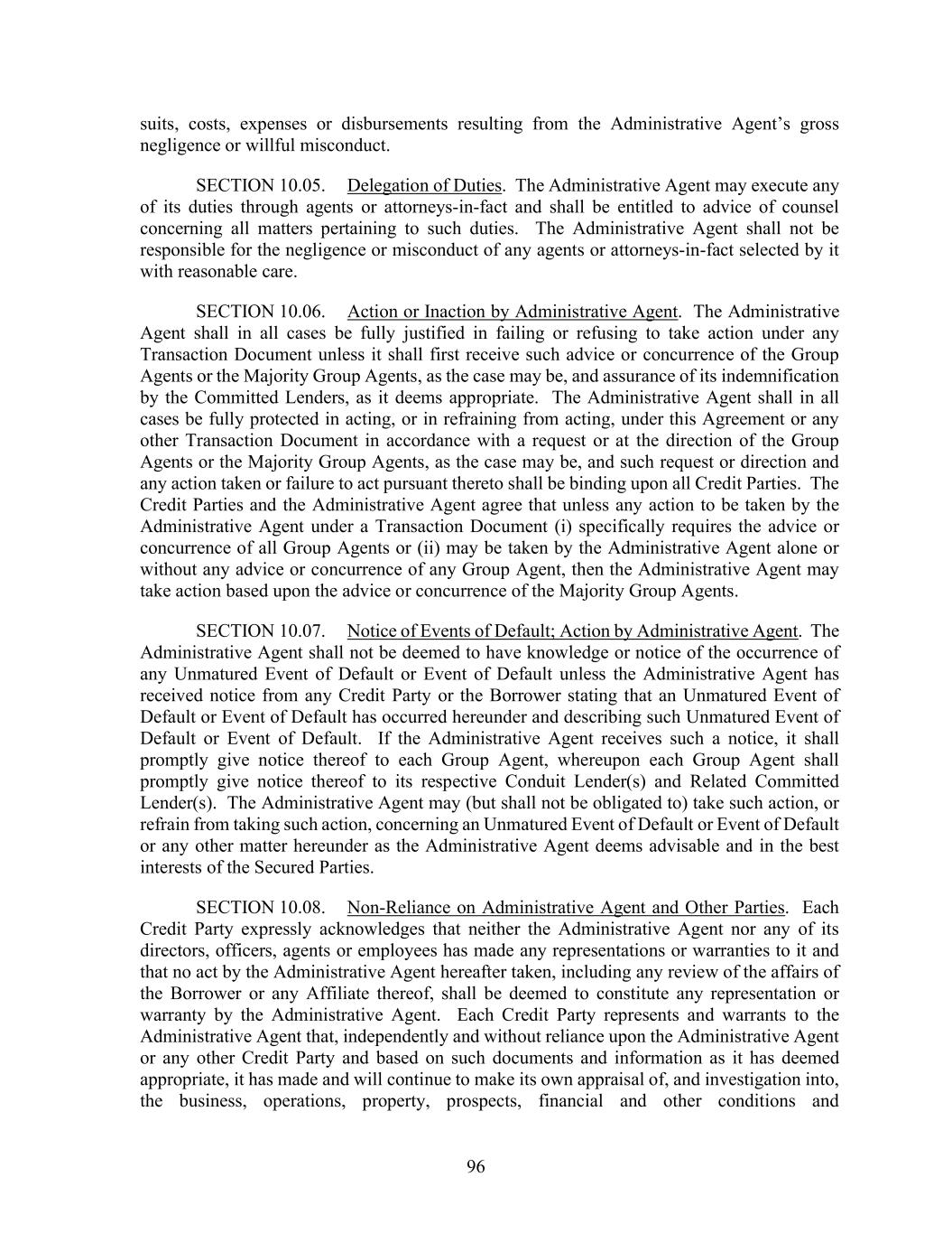 96 suits, costs, expenses or disbursements resulting from the Administrative Agent’s gross negligence or willful misconduct. SECTION 10.05. Delegation of Duties. The Administrative Agent may execute any of its duties through agents or attorneys-in-fact and shall be entitled to advice of counsel concerning all matters pertaining to such duties. The Administrative Agent shall not be responsible for the negligence or misconduct of any agents or attorneys-in-fact selected by it with reasonable care. SECTION 10.06. Action or Inaction by Administrative Agent. The Administrative Agent shall in all cases be fully justified in failing or refusing to take action under any Transaction Document unless it shall first receive such advice or concurrence of the Group Agents or the Majority Group Agents, as the case may be, and assurance of its indemnification by the Committed Lenders, as it deems appropriate. The Administrative Agent shall in all cases be fully protected in acting, or in refraining from acting, under this Agreement or any other Transaction Document in accordance with a request or at the direction of the Group Agents or the Majority Group Agents, as the case may be, and such request or direction and any action taken or failure to act pursuant thereto shall be binding upon all Credit Parties. The Credit Parties and the Administrative Agent agree that unless any action to be taken by the Administrative Agent under a Transaction Document (i) specifically requires the advice or concurrence of all Group Agents or (ii) may be taken by the Administrative Agent alone or without any advice or concurrence of any Group Agent, then the Administrative Agent may take action based upon the advice or concurrence of the Majority Group Agents. SECTION 10.07. Notice of Events of Default; Action by Administrative Agent. The Administrative Agent shall not be deemed to have knowledge or notice of the occurrence of any Unmatured Event of Default or Event of Default unless the Administrative Agent has received notice from any Credit Party or the Borrower stating that an Unmatured Event of Default or Event of Default has occurred hereunder and describing such Unmatured Event of Default or Event of Default. If the Administrative Agent receives such a notice, it shall promptly give notice thereof to each Group Agent, whereupon each Group Agent shall promptly give notice thereof to its respective Conduit Lender(s) and Related Committed Lender(s). The Administrative Agent may (but shall not be obligated to) take such action, or refrain from taking such action, concerning an Unmatured Event of Default or Event of Default or any other matter hereunder as the Administrative Agent deems advisable and in the best interests of the Secured Parties. SECTION 10.08. Non-Reliance on Administrative Agent and Other Parties. Each Credit Party expressly acknowledges that neither the Administrative Agent nor any of its directors, officers, agents or employees has made any representations or warranties to it and that no act by the Administrative Agent hereafter taken, including any review of the affairs of the Borrower or any Affiliate thereof, shall be deemed to constitute any representation or warranty by the Administrative Agent. Each Credit Party represents and warrants to the Administrative Agent that, independently and without reliance upon the Administrative Agent or any other Credit Party and based on such documents and information as it has deemed appropriate, it has made and will continue to make its own appraisal of, and investigation into, the business, operations, property, prospects, financial and other conditions and