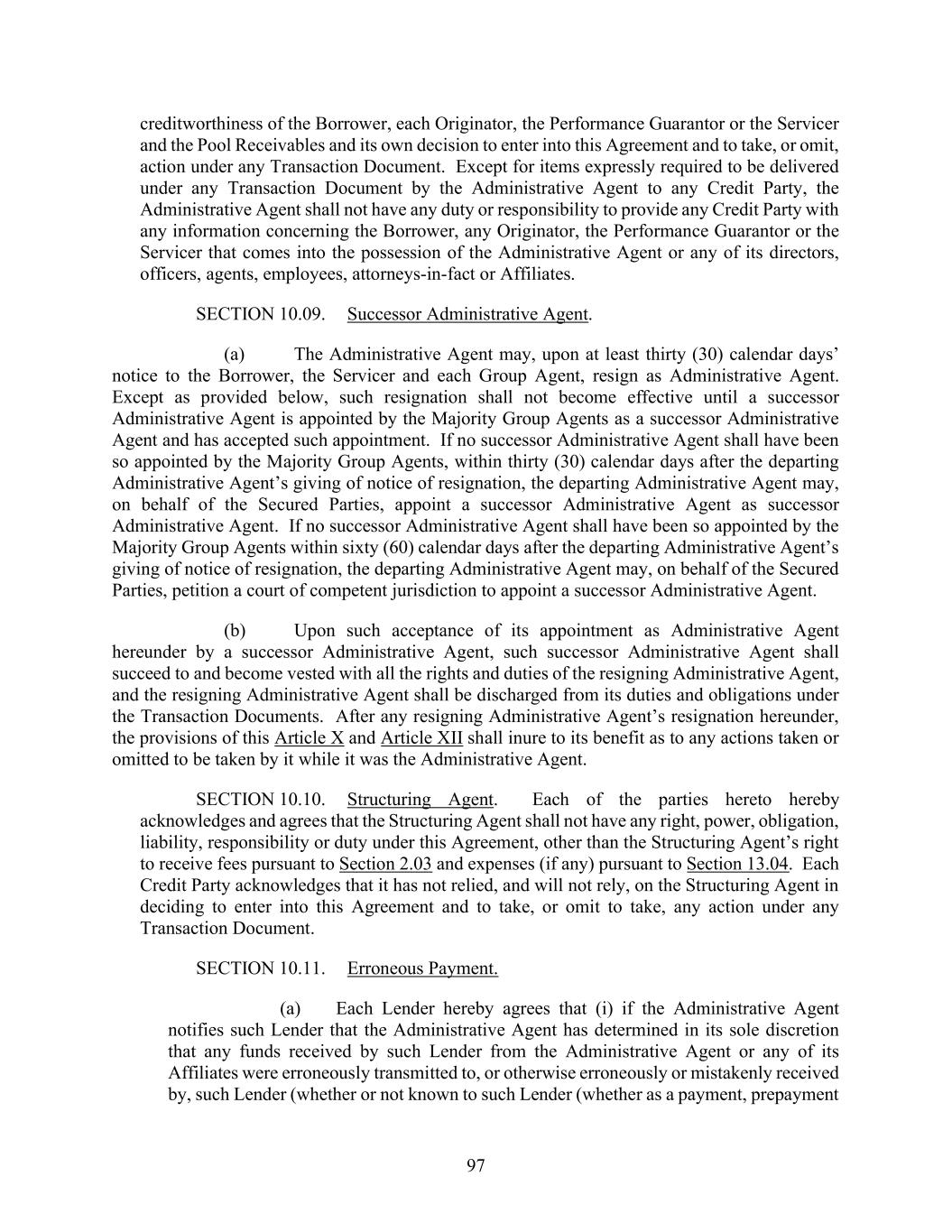 97 creditworthiness of the Borrower, each Originator, the Performance Guarantor or the Servicer and the Pool Receivables and its own decision to enter into this Agreement and to take, or omit, action under any Transaction Document. Except for items expressly required to be delivered under any Transaction Document by the Administrative Agent to any Credit Party, the Administrative Agent shall not have any duty or responsibility to provide any Credit Party with any information concerning the Borrower, any Originator, the Performance Guarantor or the Servicer that comes into the possession of the Administrative Agent or any of its directors, officers, agents, employees, attorneys-in-fact or Affiliates. SECTION 10.09. Successor Administrative Agent. (a) The Administrative Agent may, upon at least thirty (30) calendar days’ notice to the Borrower, the Servicer and each Group Agent, resign as Administrative Agent. Except as provided below, such resignation shall not become effective until a successor Administrative Agent is appointed by the Majority Group Agents as a successor Administrative Agent and has accepted such appointment. If no successor Administrative Agent shall have been so appointed by the Majority Group Agents, within thirty (30) calendar days after the departing Administrative Agent’s giving of notice of resignation, the departing Administrative Agent may, on behalf of the Secured Parties, appoint a successor Administrative Agent as successor Administrative Agent. If no successor Administrative Agent shall have been so appointed by the Majority Group Agents within sixty (60) calendar days after the departing Administrative Agent’s giving of notice of resignation, the departing Administrative Agent may, on behalf of the Secured Parties, petition a court of competent jurisdiction to appoint a successor Administrative Agent. (b) Upon such acceptance of its appointment as Administrative Agent hereunder by a successor Administrative Agent, such successor Administrative Agent shall succeed to and become vested with all the rights and duties of the resigning Administrative Agent, and the resigning Administrative Agent shall be discharged from its duties and obligations under the Transaction Documents. After any resigning Administrative Agent’s resignation hereunder, the provisions of this Article X and Article XII shall inure to its benefit as to any actions taken or omitted to be taken by it while it was the Administrative Agent. SECTION 10.10. Structuring Agent. Each of the parties hereto hereby acknowledges and agrees that the Structuring Agent shall not have any right, power, obligation, liability, responsibility or duty under this Agreement, other than the Structuring Agent’s right to receive fees pursuant to Section 2.03 and expenses (if any) pursuant to Section 13.04. Each Credit Party acknowledges that it has not relied, and will not rely, on the Structuring Agent in deciding to enter into this Agreement and to take, or omit to take, any action under any Transaction Document. SECTION 10.11. Erroneous Payment. (a) Each Lender hereby agrees that (i) if the Administrative Agent notifies such Lender that the Administrative Agent has determined in its sole discretion that any funds received by such Lender from the Administrative Agent or any of its Affiliates were erroneously transmitted to, or otherwise erroneously or mistakenly received by, such Lender (whether or not known to such Lender (whether as a payment, prepayment
