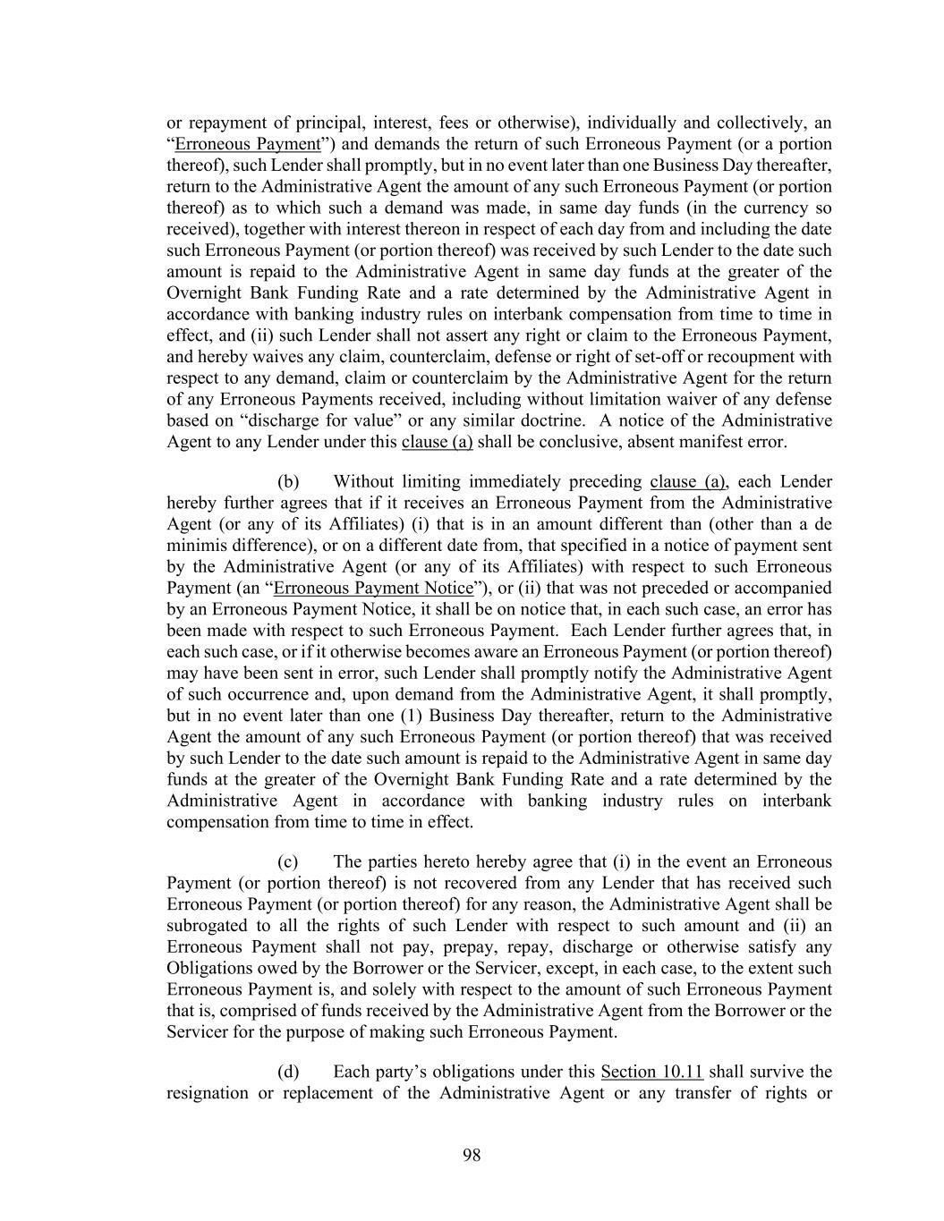 98 or repayment of principal, interest, fees or otherwise), individually and collectively, an “Erroneous Payment”) and demands the return of such Erroneous Payment (or a portion thereof), such Lender shall promptly, but in no event later than one Business Day thereafter, return to the Administrative Agent the amount of any such Erroneous Payment (or portion thereof) as to which such a demand was made, in same day funds (in the currency so received), together with interest thereon in respect of each day from and including the date such Erroneous Payment (or portion thereof) was received by such Lender to the date such amount is repaid to the Administrative Agent in same day funds at the greater of the Overnight Bank Funding Rate and a rate determined by the Administrative Agent in accordance with banking industry rules on interbank compensation from time to time in effect, and (ii) such Lender shall not assert any right or claim to the Erroneous Payment, and hereby waives any claim, counterclaim, defense or right of set-off or recoupment with respect to any demand, claim or counterclaim by the Administrative Agent for the return of any Erroneous Payments received, including without limitation waiver of any defense based on “discharge for value” or any similar doctrine. A notice of the Administrative Agent to any Lender under this clause (a) shall be conclusive, absent manifest error. (b) Without limiting immediately preceding clause (a), each Lender hereby further agrees that if it receives an Erroneous Payment from the Administrative Agent (or any of its Affiliates) (i) that is in an amount different than (other than a de minimis difference), or on a different date from, that specified in a notice of payment sent by the Administrative Agent (or any of its Affiliates) with respect to such Erroneous Payment (an “Erroneous Payment Notice”), or (ii) that was not preceded or accompanied by an Erroneous Payment Notice, it shall be on notice that, in each such case, an error has been made with respect to such Erroneous Payment. Each Lender further agrees that, in each such case, or if it otherwise becomes aware an Erroneous Payment (or portion thereof) may have been sent in error, such Lender shall promptly notify the Administrative Agent of such occurrence and, upon demand from the Administrative Agent, it shall promptly, but in no event later than one (1) Business Day thereafter, return to the Administrative Agent the amount of any such Erroneous Payment (or portion thereof) that was received by such Lender to the date such amount is repaid to the Administrative Agent in same day funds at the greater of the Overnight Bank Funding Rate and a rate determined by the Administrative Agent in accordance with banking industry rules on interbank compensation from time to time in effect. (c) The parties hereto hereby agree that (i) in the event an Erroneous Payment (or portion thereof) is not recovered from any Lender that has received such Erroneous Payment (or portion thereof) for any reason, the Administrative Agent shall be subrogated to all the rights of such Lender with respect to such amount and (ii) an Erroneous Payment shall not pay, prepay, repay, discharge or otherwise satisfy any Obligations owed by the Borrower or the Servicer, except, in each case, to the extent such Erroneous Payment is, and solely with respect to the amount of such Erroneous Payment that is, comprised of funds received by the Administrative Agent from the Borrower or the Servicer for the purpose of making such Erroneous Payment. (d) Each party’s obligations under this Section 10.11 shall survive the resignation or replacement of the Administrative Agent or any transfer of rights or