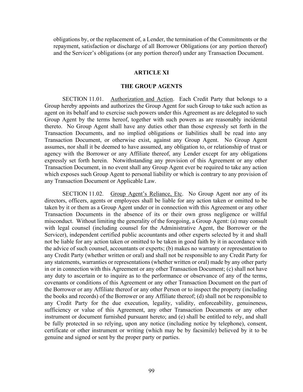 99 obligations by, or the replacement of, a Lender, the termination of the Commitments or the repayment, satisfaction or discharge of all Borrower Obligations (or any portion thereof) and the Servicer’s obligations (or any portion thereof) under any Transaction Document. ARTICLE XI THE GROUP AGENTS SECTION 11.01. Authorization and Action. Each Credit Party that belongs to a Group hereby appoints and authorizes the Group Agent for such Group to take such action as agent on its behalf and to exercise such powers under this Agreement as are delegated to such Group Agent by the terms hereof, together with such powers as are reasonably incidental thereto. No Group Agent shall have any duties other than those expressly set forth in the Transaction Documents, and no implied obligations or liabilities shall be read into any Transaction Document, or otherwise exist, against any Group Agent. No Group Agent assumes, nor shall it be deemed to have assumed, any obligation to, or relationship of trust or agency with the Borrower or any Affiliate thereof, any Lender except for any obligations expressly set forth herein. Notwithstanding any provision of this Agreement or any other Transaction Document, in no event shall any Group Agent ever be required to take any action which exposes such Group Agent to personal liability or which is contrary to any provision of any Transaction Document or Applicable Law. SECTION 11.02. Group Agent’s Reliance, Etc. No Group Agent nor any of its directors, officers, agents or employees shall be liable for any action taken or omitted to be taken by it or them as a Group Agent under or in connection with this Agreement or any other Transaction Documents in the absence of its or their own gross negligence or willful misconduct. Without limiting the generality of the foregoing, a Group Agent: (a) may consult with legal counsel (including counsel for the Administrative Agent, the Borrower or the Servicer), independent certified public accountants and other experts selected by it and shall not be liable for any action taken or omitted to be taken in good faith by it in accordance with the advice of such counsel, accountants or experts; (b) makes no warranty or representation to any Credit Party (whether written or oral) and shall not be responsible to any Credit Party for any statements, warranties or representations (whether written or oral) made by any other party in or in connection with this Agreement or any other Transaction Document; (c) shall not have any duty to ascertain or to inquire as to the performance or observance of any of the terms, covenants or conditions of this Agreement or any other Transaction Document on the part of the Borrower or any Affiliate thereof or any other Person or to inspect the property (including the books and records) of the Borrower or any Affiliate thereof; (d) shall not be responsible to any Credit Party for the due execution, legality, validity, enforceability, genuineness, sufficiency or value of this Agreement, any other Transaction Documents or any other instrument or document furnished pursuant hereto; and (e) shall be entitled to rely, and shall be fully protected in so relying, upon any notice (including notice by telephone), consent, certificate or other instrument or writing (which may be by facsimile) believed by it to be genuine and signed or sent by the proper party or parties.