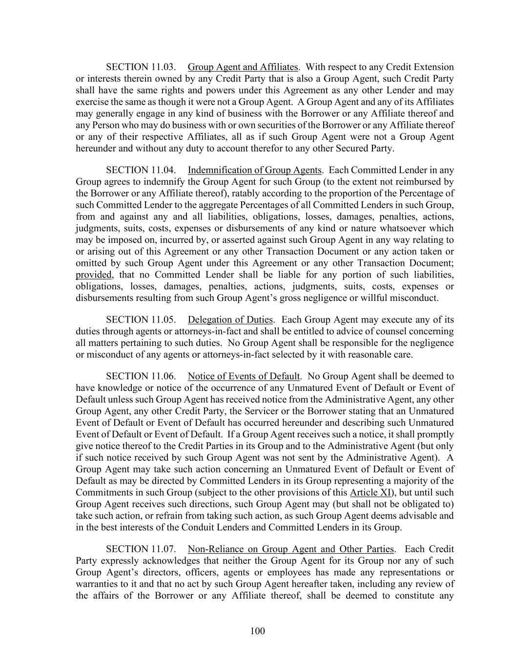 100 SECTION 11.03. Group Agent and Affiliates. With respect to any Credit Extension or interests therein owned by any Credit Party that is also a Group Agent, such Credit Party shall have the same rights and powers under this Agreement as any other Lender and may exercise the same as though it were not a Group Agent. A Group Agent and any of its Affiliates may generally engage in any kind of business with the Borrower or any Affiliate thereof and any Person who may do business with or own securities of the Borrower or any Affiliate thereof or any of their respective Affiliates, all as if such Group Agent were not a Group Agent hereunder and without any duty to account therefor to any other Secured Party. SECTION 11.04. Indemnification of Group Agents. Each Committed Lender in any Group agrees to indemnify the Group Agent for such Group (to the extent not reimbursed by the Borrower or any Affiliate thereof), ratably according to the proportion of the Percentage of such Committed Lender to the aggregate Percentages of all Committed Lenders in such Group, from and against any and all liabilities, obligations, losses, damages, penalties, actions, judgments, suits, costs, expenses or disbursements of any kind or nature whatsoever which may be imposed on, incurred by, or asserted against such Group Agent in any way relating to or arising out of this Agreement or any other Transaction Document or any action taken or omitted by such Group Agent under this Agreement or any other Transaction Document; provided, that no Committed Lender shall be liable for any portion of such liabilities, obligations, losses, damages, penalties, actions, judgments, suits, costs, expenses or disbursements resulting from such Group Agent’s gross negligence or willful misconduct. SECTION 11.05. Delegation of Duties. Each Group Agent may execute any of its duties through agents or attorneys-in-fact and shall be entitled to advice of counsel concerning all matters pertaining to such duties. No Group Agent shall be responsible for the negligence or misconduct of any agents or attorneys-in-fact selected by it with reasonable care. SECTION 11.06. Notice of Events of Default. No Group Agent shall be deemed to have knowledge or notice of the occurrence of any Unmatured Event of Default or Event of Default unless such Group Agent has received notice from the Administrative Agent, any other Group Agent, any other Credit Party, the Servicer or the Borrower stating that an Unmatured Event of Default or Event of Default has occurred hereunder and describing such Unmatured Event of Default or Event of Default. If a Group Agent receives such a notice, it shall promptly give notice thereof to the Credit Parties in its Group and to the Administrative Agent (but only if such notice received by such Group Agent was not sent by the Administrative Agent). A Group Agent may take such action concerning an Unmatured Event of Default or Event of Default as may be directed by Committed Lenders in its Group representing a majority of the Commitments in such Group (subject to the other provisions of this Article XI), but until such Group Agent receives such directions, such Group Agent may (but shall not be obligated to) take such action, or refrain from taking such action, as such Group Agent deems advisable and in the best interests of the Conduit Lenders and Committed Lenders in its Group. SECTION 11.07. Non-Reliance on Group Agent and Other Parties. Each Credit Party expressly acknowledges that neither the Group Agent for its Group nor any of such Group Agent’s directors, officers, agents or employees has made any representations or warranties to it and that no act by such Group Agent hereafter taken, including any review of the affairs of the Borrower or any Affiliate thereof, shall be deemed to constitute any