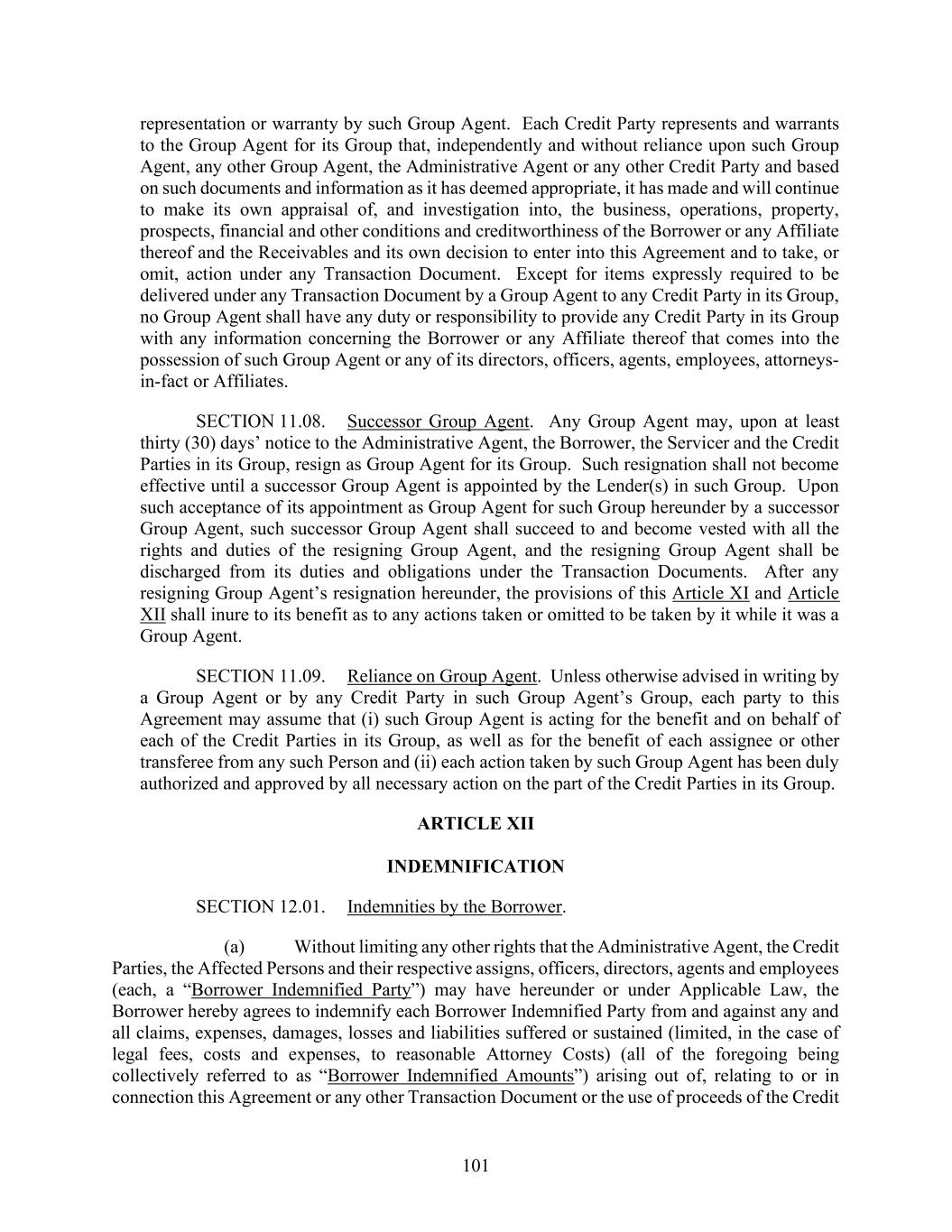 101 representation or warranty by such Group Agent. Each Credit Party represents and warrants to the Group Agent for its Group that, independently and without reliance upon such Group Agent, any other Group Agent, the Administrative Agent or any other Credit Party and based on such documents and information as it has deemed appropriate, it has made and will continue to make its own appraisal of, and investigation into, the business, operations, property, prospects, financial and other conditions and creditworthiness of the Borrower or any Affiliate thereof and the Receivables and its own decision to enter into this Agreement and to take, or omit, action under any Transaction Document. Except for items expressly required to be delivered under any Transaction Document by a Group Agent to any Credit Party in its Group, no Group Agent shall have any duty or responsibility to provide any Credit Party in its Group with any information concerning the Borrower or any Affiliate thereof that comes into the possession of such Group Agent or any of its directors, officers, agents, employees, attorneys- in-fact or Affiliates. SECTION 11.08. Successor Group Agent. Any Group Agent may, upon at least thirty (30) days’ notice to the Administrative Agent, the Borrower, the Servicer and the Credit Parties in its Group, resign as Group Agent for its Group. Such resignation shall not become effective until a successor Group Agent is appointed by the Lender(s) in such Group. Upon such acceptance of its appointment as Group Agent for such Group hereunder by a successor Group Agent, such successor Group Agent shall succeed to and become vested with all the rights and duties of the resigning Group Agent, and the resigning Group Agent shall be discharged from its duties and obligations under the Transaction Documents. After any resigning Group Agent’s resignation hereunder, the provisions of this Article XI and Article XII shall inure to its benefit as to any actions taken or omitted to be taken by it while it was a Group Agent. SECTION 11.09. Reliance on Group Agent. Unless otherwise advised in writing by a Group Agent or by any Credit Party in such Group Agent’s Group, each party to this Agreement may assume that (i) such Group Agent is acting for the benefit and on behalf of each of the Credit Parties in its Group, as well as for the benefit of each assignee or other transferee from any such Person and (ii) each action taken by such Group Agent has been duly authorized and approved by all necessary action on the part of the Credit Parties in its Group. ARTICLE XII INDEMNIFICATION SECTION 12.01. Indemnities by the Borrower. (a) Without limiting any other rights that the Administrative Agent, the Credit Parties, the Affected Persons and their respective assigns, officers, directors, agents and employees (each, a “Borrower Indemnified Party”) may have hereunder or under Applicable Law, the Borrower hereby agrees to indemnify each Borrower Indemnified Party from and against any and all claims, expenses, damages, losses and liabilities suffered or sustained (limited, in the case of legal fees, costs and expenses, to reasonable Attorney Costs) (all of the foregoing being collectively referred to as “Borrower Indemnified Amounts”) arising out of, relating to or in connection this Agreement or any other Transaction Document or the use of proceeds of the Credit