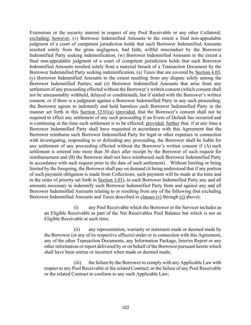102 Extensions or the security interest in respect of any Pool Receivable or any other Collateral; excluding, however, (v) Borrower Indemnified Amounts to the extent a final non-appealable judgment of a court of competent jurisdiction holds that such Borrower Indemnified Amounts resulted solely from the gross negligence, bad faith, willful misconduct by the Borrower Indemnified Party seeking indemnification, (w) Borrower Indemnified Amounts to the extent a final non-appealable judgment of a court of competent jurisdiction holds that such Borrower Indemnified Amounts resulted solely from a material breach of a Transaction Document by the Borrower Indemnified Party seeking indemnification, (x) Taxes that are covered by Section 4.03, (y) Borrower Indemnified Amounts to the extent resulting from any dispute solely among the Borrower Indemnified Parties, and (z) Borrower Indemnified Amounts that arise from any settlement of any proceeding effected without the Borrower’s written consent (which consent shall not be unreasonably withheld, delayed or conditioned), but if settled with the Borrower’s written consent, or if there is a judgment against a Borrower Indemnified Party in any such proceeding, the Borrower agrees to indemnify and hold harmless each Borrower Indemnified Party in the manner set forth in this Section 12.01(a) (provided, that the Borrower’s consent shall not be required to effect any settlement of any such proceeding if an Event of Default has occurred and is continuing at the time such settlement is to be effected; provided, further that, if at any time a Borrower Indemnified Party shall have requested in accordance with this Agreement that the Borrower reimburse such Borrower Indemnified Party for legal or other expenses in connection with investigating, responding to or defending any proceeding, the Borrower shall be liable for any settlement of any proceeding effected without the Borrower’s written consent if (A) such settlement is entered into more than 30 days after receipt by the Borrower of such request for reimbursement and (B) the Borrower shall not have reimbursed such Borrower Indemnified Party in accordance with such request prior to the date of such settlement) . Without limiting or being limited by the foregoing, the Borrower shall pay on demand (it being understood that if any portion of such payment obligation is made from Collections, such payment will be made at the time and in the order of priority set forth in Section 3.01), to each Borrower Indemnified Party any and all amounts necessary to indemnify such Borrower Indemnified Party from and against any and all Borrower Indemnified Amounts relating to or resulting from any of the following (but excluding Borrower Indemnified Amounts and Taxes described in clauses (v) through (z) above): (i) any Pool Receivable which the Borrower or the Servicer includes as an Eligible Receivable as part of the Net Receivables Pool Balance but which is not an Eligible Receivable at such time; (ii) any representation, warranty or statement made or deemed made by the Borrower (or any of its respective officers) under or in connection with this Agreement, any of the other Transaction Documents, any Information Package, Interim Report or any other information or report delivered by or on behalf of the Borrower pursuant hereto which shall have been untrue or incorrect when made or deemed made; (iii) the failure by the Borrower to comply with any Applicable Law with respect to any Pool Receivable or the related Contract; or the failure of any Pool Receivable or the related Contract to conform to any such Applicable Law;