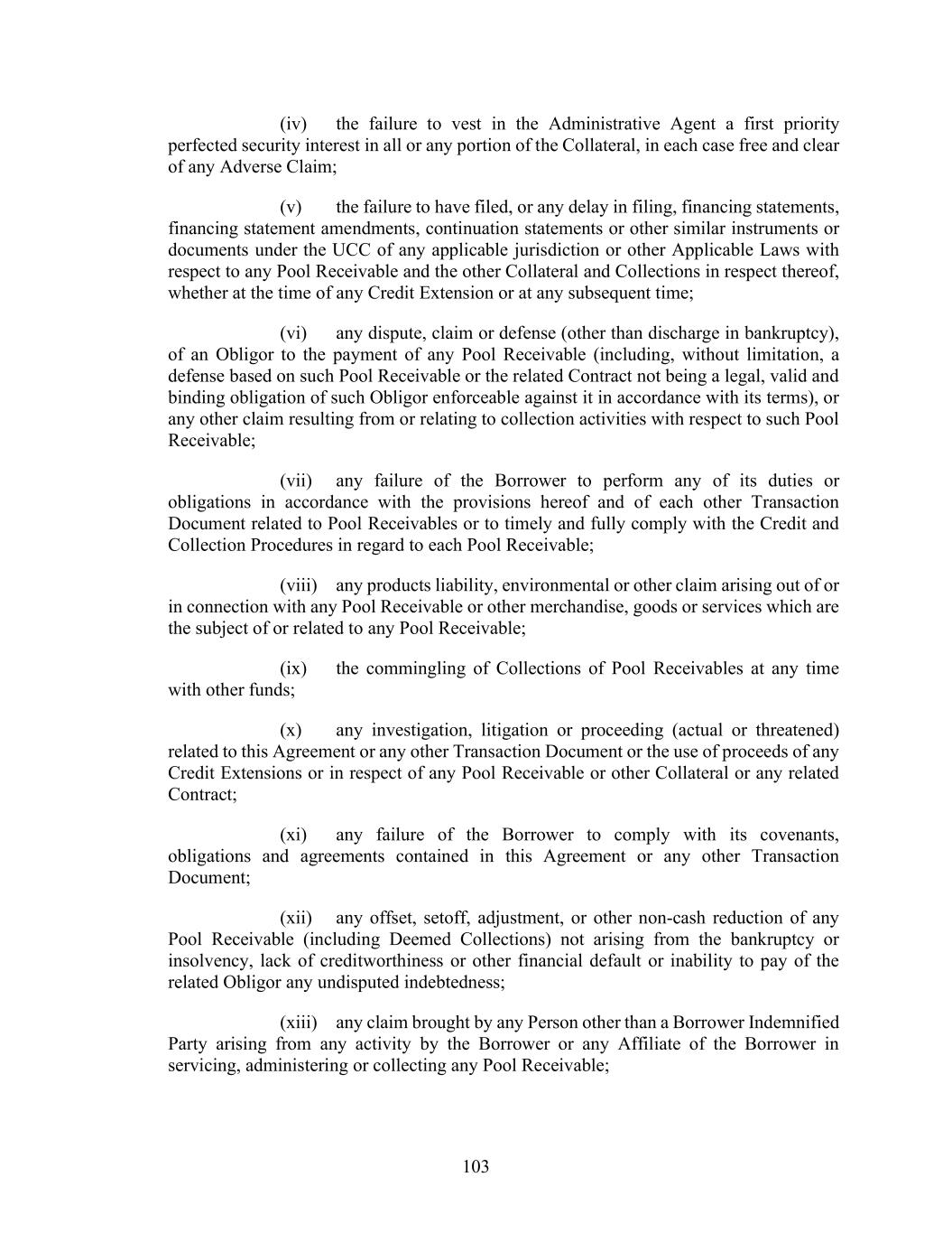 103 (iv) the failure to vest in the Administrative Agent a first priority perfected security interest in all or any portion of the Collateral, in each case free and clear of any Adverse Claim; (v) the failure to have filed, or any delay in filing, financing statements, financing statement amendments, continuation statements or other similar instruments or documents under the UCC of any applicable jurisdiction or other Applicable Laws with respect to any Pool Receivable and the other Collateral and Collections in respect thereof, whether at the time of any Credit Extension or at any subsequent time; (vi) any dispute, claim or defense (other than discharge in bankruptcy), of an Obligor to the payment of any Pool Receivable (including, without limitation, a defense based on such Pool Receivable or the related Contract not being a legal, valid and binding obligation of such Obligor enforceable against it in accordance with its terms), or any other claim resulting from or relating to collection activities with respect to such Pool Receivable; (vii) any failure of the Borrower to perform any of its duties or obligations in accordance with the provisions hereof and of each other Transaction Document related to Pool Receivables or to timely and fully comply with the Credit and Collection Procedures in regard to each Pool Receivable; (viii) any products liability, environmental or other claim arising out of or in connection with any Pool Receivable or other merchandise, goods or services which are the subject of or related to any Pool Receivable; (ix) the commingling of Collections of Pool Receivables at any time with other funds; (x) any investigation, litigation or proceeding (actual or threatened) related to this Agreement or any other Transaction Document or the use of proceeds of any Credit Extensions or in respect of any Pool Receivable or other Collateral or any related Contract; (xi) any failure of the Borrower to comply with its covenants, obligations and agreements contained in this Agreement or any other Transaction Document; (xii) any offset, setoff, adjustment, or other non-cash reduction of any Pool Receivable (including Deemed Collections) not arising from the bankruptcy or insolvency, lack of creditworthiness or other financial default or inability to pay of the related Obligor any undisputed indebtedness; (xiii) any claim brought by any Person other than a Borrower Indemnified Party arising from any activity by the Borrower or any Affiliate of the Borrower in servicing, administering or collecting any Pool Receivable;