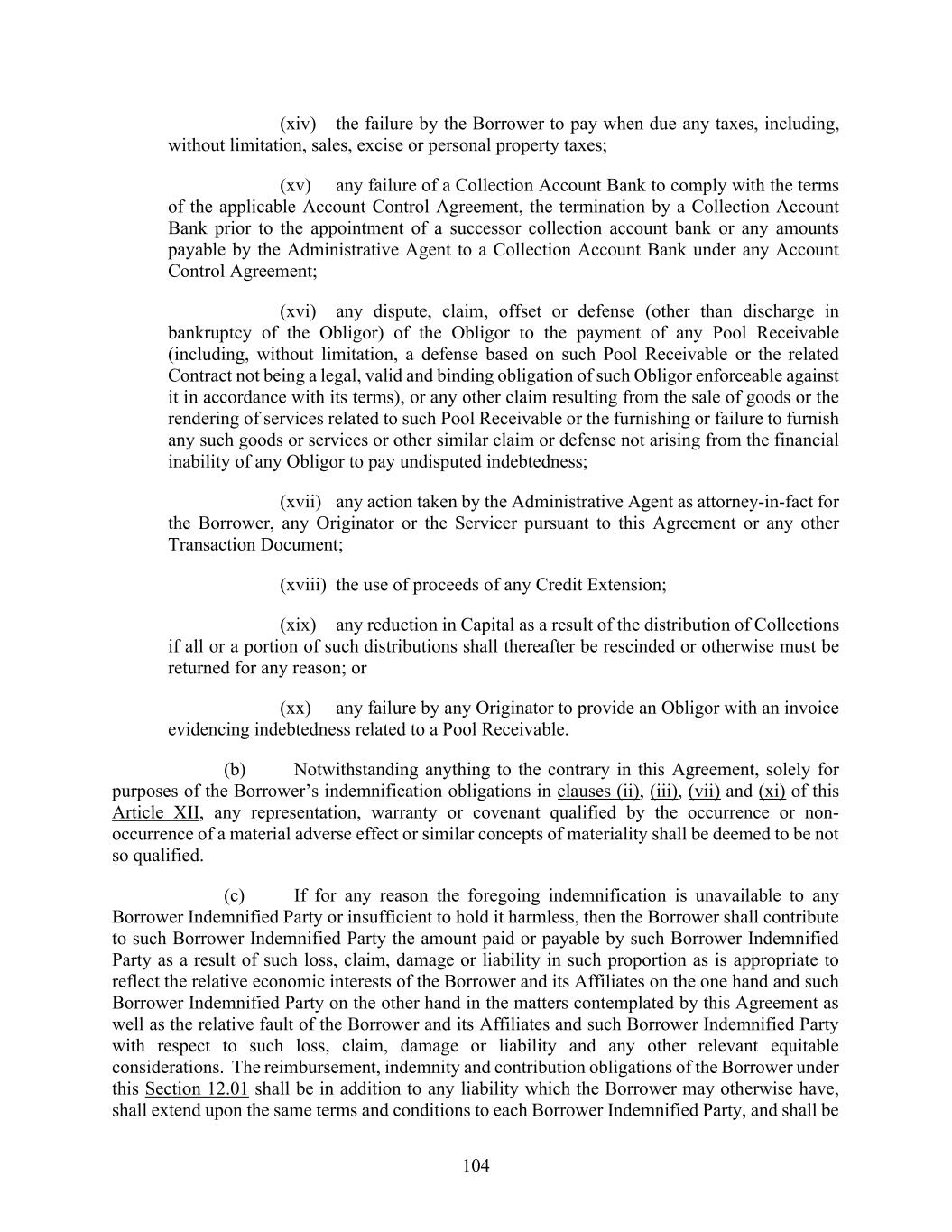 104 (xiv) the failure by the Borrower to pay when due any taxes, including, without limitation, sales, excise or personal property taxes; (xv) any failure of a Collection Account Bank to comply with the terms of the applicable Account Control Agreement, the termination by a Collection Account Bank prior to the appointment of a successor collection account bank or any amounts payable by the Administrative Agent to a Collection Account Bank under any Account Control Agreement; (xvi) any dispute, claim, offset or defense (other than discharge in bankruptcy of the Obligor) of the Obligor to the payment of any Pool Receivable (including, without limitation, a defense based on such Pool Receivable or the related Contract not being a legal, valid and binding obligation of such Obligor enforceable against it in accordance with its terms), or any other claim resulting from the sale of goods or the rendering of services related to such Pool Receivable or the furnishing or failure to furnish any such goods or services or other similar claim or defense not arising from the financial inability of any Obligor to pay undisputed indebtedness; (xvii) any action taken by the Administrative Agent as attorney-in-fact for the Borrower, any Originator or the Servicer pursuant to this Agreement or any other Transaction Document; (xviii) the use of proceeds of any Credit Extension; (xix) any reduction in Capital as a result of the distribution of Collections if all or a portion of such distributions shall thereafter be rescinded or otherwise must be returned for any reason; or (xx) any failure by any Originator to provide an Obligor with an invoice evidencing indebtedness related to a Pool Receivable. (b) Notwithstanding anything to the contrary in this Agreement, solely for purposes of the Borrower’s indemnification obligations in clauses (ii), (iii), (vii) and (xi) of this Article XII, any representation, warranty or covenant qualified by the occurrence or non- occurrence of a material adverse effect or similar concepts of materiality shall be deemed to be not so qualified. (c) If for any reason the foregoing indemnification is unavailable to any Borrower Indemnified Party or insufficient to hold it harmless, then the Borrower shall contribute to such Borrower Indemnified Party the amount paid or payable by such Borrower Indemnified Party as a result of such loss, claim, damage or liability in such proportion as is appropriate to reflect the relative economic interests of the Borrower and its Affiliates on the one hand and such Borrower Indemnified Party on the other hand in the matters contemplated by this Agreement as well as the relative fault of the Borrower and its Affiliates and such Borrower Indemnified Party with respect to such loss, claim, damage or liability and any other relevant equitable considerations. The reimbursement, indemnity and contribution obligations of the Borrower under this Section 12.01 shall be in addition to any liability which the Borrower may otherwise have, shall extend upon the same terms and conditions to each Borrower Indemnified Party, and shall be