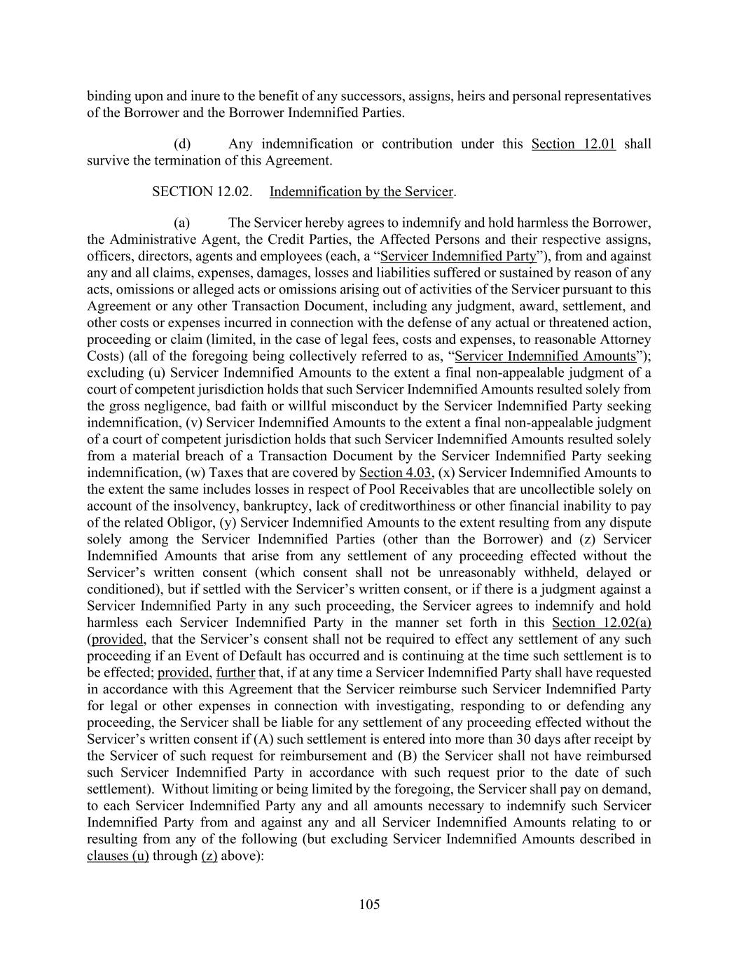 105 binding upon and inure to the benefit of any successors, assigns, heirs and personal representatives of the Borrower and the Borrower Indemnified Parties. (d) Any indemnification or contribution under this Section 12.01 shall survive the termination of this Agreement. SECTION 12.02. Indemnification by the Servicer. (a) The Servicer hereby agrees to indemnify and hold harmless the Borrower, the Administrative Agent, the Credit Parties, the Affected Persons and their respective assigns, officers, directors, agents and employees (each, a “Servicer Indemnified Party”), from and against any and all claims, expenses, damages, losses and liabilities suffered or sustained by reason of any acts, omissions or alleged acts or omissions arising out of activities of the Servicer pursuant to this Agreement or any other Transaction Document, including any judgment, award, settlement, and other costs or expenses incurred in connection with the defense of any actual or threatened action, proceeding or claim (limited, in the case of legal fees, costs and expenses, to reasonable Attorney Costs) (all of the foregoing being collectively referred to as, “Servicer Indemnified Amounts”); excluding (u) Servicer Indemnified Amounts to the extent a final non-appealable judgment of a court of competent jurisdiction holds that such Servicer Indemnified Amounts resulted solely from the gross negligence, bad faith or willful misconduct by the Servicer Indemnified Party seeking indemnification, (v) Servicer Indemnified Amounts to the extent a final non-appealable judgment of a court of competent jurisdiction holds that such Servicer Indemnified Amounts resulted solely from a material breach of a Transaction Document by the Servicer Indemnified Party seeking indemnification, (w) Taxes that are covered by Section 4.03, (x) Servicer Indemnified Amounts to the extent the same includes losses in respect of Pool Receivables that are uncollectible solely on account of the insolvency, bankruptcy, lack of creditworthiness or other financial inability to pay of the related Obligor, (y) Servicer Indemnified Amounts to the extent resulting from any dispute solely among the Servicer Indemnified Parties (other than the Borrower) and (z) Servicer Indemnified Amounts that arise from any settlement of any proceeding effected without the Servicer’s written consent (which consent shall not be unreasonably withheld, delayed or conditioned), but if settled with the Servicer’s written consent, or if there is a judgment against a Servicer Indemnified Party in any such proceeding, the Servicer agrees to indemnify and hold harmless each Servicer Indemnified Party in the manner set forth in this Section 12.02(a) (provided, that the Servicer’s consent shall not be required to effect any settlement of any such proceeding if an Event of Default has occurred and is continuing at the time such settlement is to be effected; provided, further that, if at any time a Servicer Indemnified Party shall have requested in accordance with this Agreement that the Servicer reimburse such Servicer Indemnified Party for legal or other expenses in connection with investigating, responding to or defending any proceeding, the Servicer shall be liable for any settlement of any proceeding effected without the Servicer’s written consent if (A) such settlement is entered into more than 30 days after receipt by the Servicer of such request for reimbursement and (B) the Servicer shall not have reimbursed such Servicer Indemnified Party in accordance with such request prior to the date of such settlement). Without limiting or being limited by the foregoing, the Servicer shall pay on demand, to each Servicer Indemnified Party any and all amounts necessary to indemnify such Servicer Indemnified Party from and against any and all Servicer Indemnified Amounts relating to or resulting from any of the following (but excluding Servicer Indemnified Amounts described in clauses (u) through (z) above):