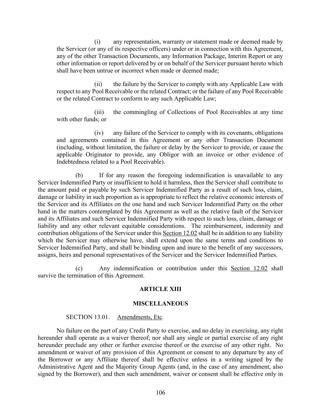 106 (i) any representation, warranty or statement made or deemed made by the Servicer (or any of its respective officers) under or in connection with this Agreement, any of the other Transaction Documents, any Information Package, Interim Report or any other information or report delivered by or on behalf of the Servicer pursuant hereto which shall have been untrue or incorrect when made or deemed made; (ii) the failure by the Servicer to comply with any Applicable Law with respect to any Pool Receivable or the related Contract; or the failure of any Pool Receivable or the related Contract to conform to any such Applicable Law; (iii) the commingling of Collections of Pool Receivables at any time with other funds; or (iv) any failure of the Servicer to comply with its covenants, obligations and agreements contained in this Agreement or any other Transaction Document (including, without limitation, the failure or delay by the Servicer to provide, or cause the applicable Originator to provide, any Obligor with an invoice or other evidence of Indebtedness related to a Pool Receivable). (b) If for any reason the foregoing indemnification is unavailable to any Servicer Indemnified Party or insufficient to hold it harmless, then the Servicer shall contribute to the amount paid or payable by such Servicer Indemnified Party as a result of such loss, claim, damage or liability in such proportion as is appropriate to reflect the relative economic interests of the Servicer and its Affiliates on the one hand and such Servicer Indemnified Party on the other hand in the matters contemplated by this Agreement as well as the relative fault of the Servicer and its Affiliates and such Servicer Indemnified Party with respect to such loss, claim, damage or liability and any other relevant equitable considerations. The reimbursement, indemnity and contribution obligations of the Servicer under this Section 12.02 shall be in addition to any liability which the Servicer may otherwise have, shall extend upon the same terms and conditions to Servicer Indemnified Party, and shall be binding upon and inure to the benefit of any successors, assigns, heirs and personal representatives of the Servicer and the Servicer Indemnified Parties. (c) Any indemnification or contribution under this Section 12.02 shall survive the termination of this Agreement. ARTICLE XIII MISCELLANEOUS SECTION 13.01. Amendments, Etc. No failure on the part of any Credit Party to exercise, and no delay in exercising, any right hereunder shall operate as a waiver thereof; nor shall any single or partial exercise of any right hereunder preclude any other or further exercise thereof or the exercise of any other right. No amendment or waiver of any provision of this Agreement or consent to any departure by any of the Borrower or any Affiliate thereof shall be effective unless in a writing signed by the Administrative Agent and the Majority Group Agents (and, in the case of any amendment, also signed by the Borrower), and then such amendment, waiver or consent shall be effective only in
