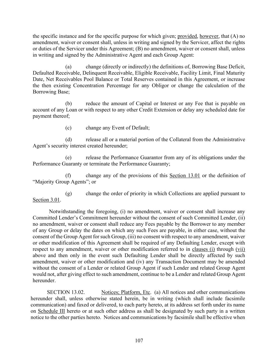 107 the specific instance and for the specific purpose for which given; provided, however, that (A) no amendment, waiver or consent shall, unless in writing and signed by the Servicer, affect the rights or duties of the Servicer under this Agreement; (B) no amendment, waiver or consent shall, unless in writing and signed by the Administrative Agent and each Group Agent: (a) change (directly or indirectly) the definitions of, Borrowing Base Deficit, Defaulted Receivable, Delinquent Receivable, Eligible Receivable, Facility Limit, Final Maturity Date, Net Receivables Pool Balance or Total Reserves contained in this Agreement, or increase the then existing Concentration Percentage for any Obligor or change the calculation of the Borrowing Base; (b) reduce the amount of Capital or Interest or any Fee that is payable on account of any Loan or with respect to any other Credit Extension or delay any scheduled date for payment thereof; (c) change any Event of Default; (d) release all or a material portion of the Collateral from the Administrative Agent’s security interest created hereunder; (e) release the Performance Guarantor from any of its obligations under the Performance Guaranty or terminate the Performance Guaranty; (f) change any of the provisions of this Section 13.01 or the definition of “Majority Group Agents”; or (g) change the order of priority in which Collections are applied pursuant to Section 3.01. Notwithstanding the foregoing, (i) no amendment, waiver or consent shall increase any Committed Lender’s Commitment hereunder without the consent of such Committed Lender, (ii) no amendment, waiver or consent shall reduce any Fees payable by the Borrower to any member of any Group or delay the dates on which any such Fees are payable, in either case, without the consent of the Group Agent for such Group, (iii) no consent with respect to any amendment, waiver or other modification of this Agreement shall be required of any Defaulting Lender, except with respect to any amendment, waiver or other modification referred to in clauses (i) through (vii) above and then only in the event such Defaulting Lender shall be directly affected by such amendment, waiver or other modification and (iv) any Transaction Document may be amended without the consent of a Lender or related Group Agent if such Lender and related Group Agent would not, after giving effect to such amendment, continue to be a Lender and related Group Agent hereunder. SECTION 13.02. Notices; Platform, Etc. (a) All notices and other communications hereunder shall, unless otherwise stated herein, be in writing (which shall include facsimile communication) and faxed or delivered, to each party hereto, at its address set forth under its name on Schedule III hereto or at such other address as shall be designated by such party in a written notice to the other parties hereto. Notices and communications by facsimile shall be effective when