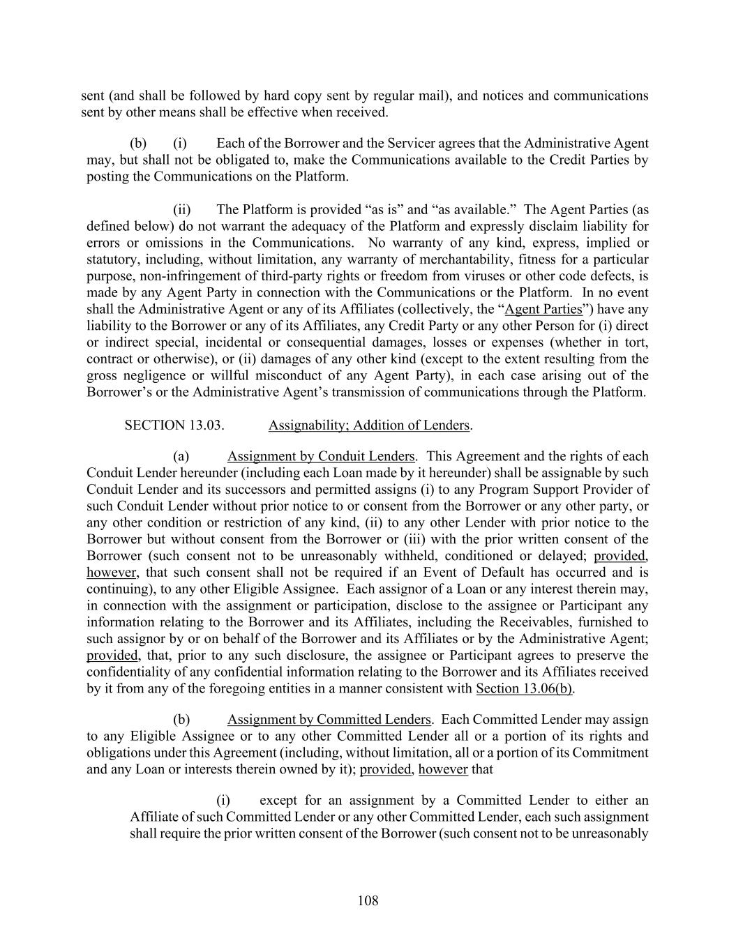 108 sent (and shall be followed by hard copy sent by regular mail), and notices and communications sent by other means shall be effective when received. (b) (i) Each of the Borrower and the Servicer agrees that the Administrative Agent may, but shall not be obligated to, make the Communications available to the Credit Parties by posting the Communications on the Platform. (ii) The Platform is provided “as is” and “as available.” The Agent Parties (as defined below) do not warrant the adequacy of the Platform and expressly disclaim liability for errors or omissions in the Communications. No warranty of any kind, express, implied or statutory, including, without limitation, any warranty of merchantability, fitness for a particular purpose, non-infringement of third-party rights or freedom from viruses or other code defects, is made by any Agent Party in connection with the Communications or the Platform. In no event shall the Administrative Agent or any of its Affiliates (collectively, the “Agent Parties”) have any liability to the Borrower or any of its Affiliates, any Credit Party or any other Person for (i) direct or indirect special, incidental or consequential damages, losses or expenses (whether in tort, contract or otherwise), or (ii) damages of any other kind (except to the extent resulting from the gross negligence or willful misconduct of any Agent Party), in each case arising out of the Borrower’s or the Administrative Agent’s transmission of communications through the Platform. SECTION 13.03. Assignability; Addition of Lenders. (a) Assignment by Conduit Lenders. This Agreement and the rights of each Conduit Lender hereunder (including each Loan made by it hereunder) shall be assignable by such Conduit Lender and its successors and permitted assigns (i) to any Program Support Provider of such Conduit Lender without prior notice to or consent from the Borrower or any other party, or any other condition or restriction of any kind, (ii) to any other Lender with prior notice to the Borrower but without consent from the Borrower or (iii) with the prior written consent of the Borrower (such consent not to be unreasonably withheld, conditioned or delayed; provided, however, that such consent shall not be required if an Event of Default has occurred and is continuing), to any other Eligible Assignee. Each assignor of a Loan or any interest therein may, in connection with the assignment or participation, disclose to the assignee or Participant any information relating to the Borrower and its Affiliates, including the Receivables, furnished to such assignor by or on behalf of the Borrower and its Affiliates or by the Administrative Agent; provided, that, prior to any such disclosure, the assignee or Participant agrees to preserve the confidentiality of any confidential information relating to the Borrower and its Affiliates received by it from any of the foregoing entities in a manner consistent with Section 13.06(b). (b) Assignment by Committed Lenders. Each Committed Lender may assign to any Eligible Assignee or to any other Committed Lender all or a portion of its rights and obligations under this Agreement (including, without limitation, all or a portion of its Commitment and any Loan or interests therein owned by it); provided, however that (i) except for an assignment by a Committed Lender to either an Affiliate of such Committed Lender or any other Committed Lender, each such assignment shall require the prior written consent of the Borrower (such consent not to be unreasonably