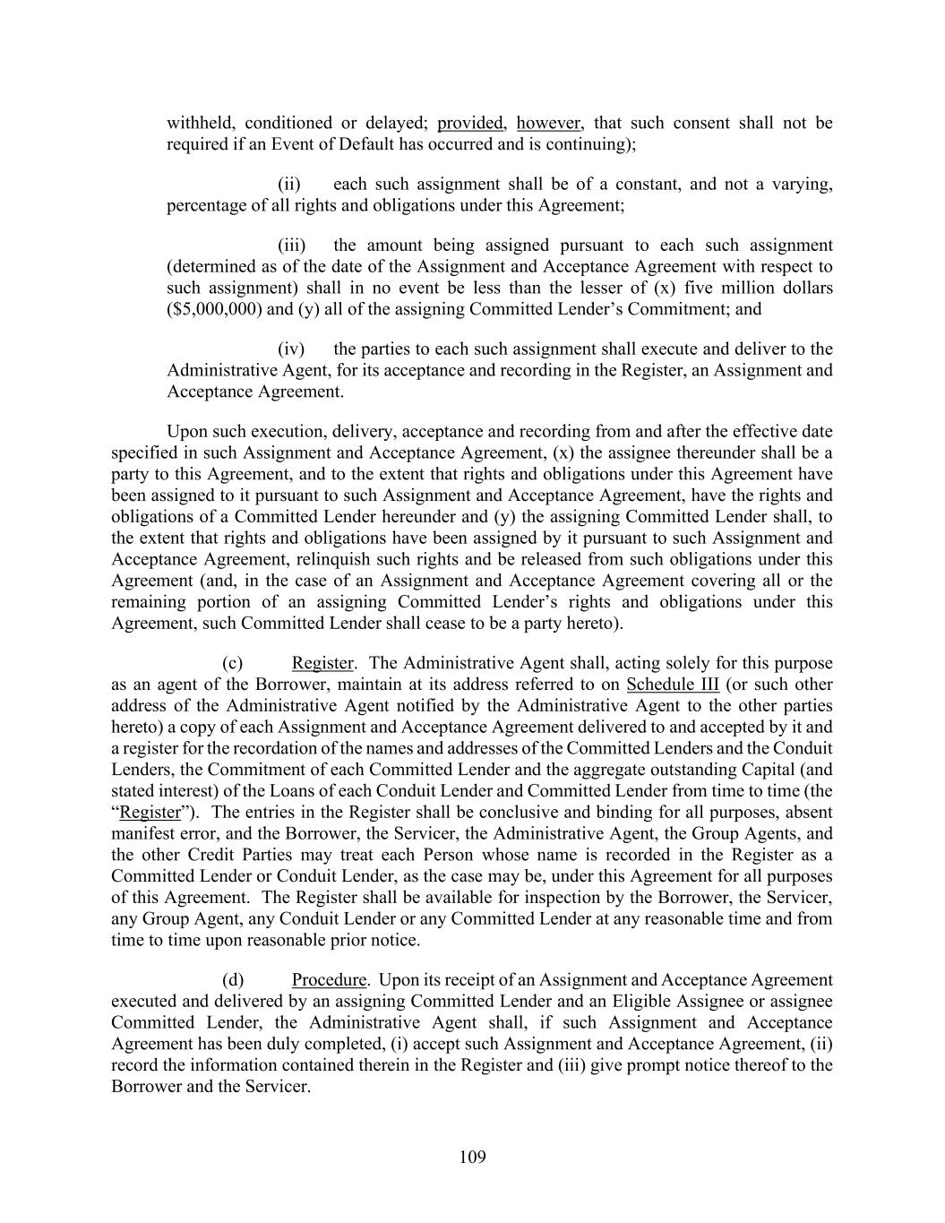 109 withheld, conditioned or delayed; provided, however, that such consent shall not be required if an Event of Default has occurred and is continuing); (ii) each such assignment shall be of a constant, and not a varying, percentage of all rights and obligations under this Agreement; (iii) the amount being assigned pursuant to each such assignment (determined as of the date of the Assignment and Acceptance Agreement with respect to such assignment) shall in no event be less than the lesser of (x) five million dollars ($5,000,000) and (y) all of the assigning Committed Lender’s Commitment; and (iv) the parties to each such assignment shall execute and deliver to the Administrative Agent, for its acceptance and recording in the Register, an Assignment and Acceptance Agreement. Upon such execution, delivery, acceptance and recording from and after the effective date specified in such Assignment and Acceptance Agreement, (x) the assignee thereunder shall be a party to this Agreement, and to the extent that rights and obligations under this Agreement have been assigned to it pursuant to such Assignment and Acceptance Agreement, have the rights and obligations of a Committed Lender hereunder and (y) the assigning Committed Lender shall, to the extent that rights and obligations have been assigned by it pursuant to such Assignment and Acceptance Agreement, relinquish such rights and be released from such obligations under this Agreement (and, in the case of an Assignment and Acceptance Agreement covering all or the remaining portion of an assigning Committed Lender’s rights and obligations under this Agreement, such Committed Lender shall cease to be a party hereto). (c) Register. The Administrative Agent shall, acting solely for this purpose as an agent of the Borrower, maintain at its address referred to on Schedule III (or such other address of the Administrative Agent notified by the Administrative Agent to the other parties hereto) a copy of each Assignment and Acceptance Agreement delivered to and accepted by it and a register for the recordation of the names and addresses of the Committed Lenders and the Conduit Lenders, the Commitment of each Committed Lender and the aggregate outstanding Capital (and stated interest) of the Loans of each Conduit Lender and Committed Lender from time to time (the “Register”). The entries in the Register shall be conclusive and binding for all purposes, absent manifest error, and the Borrower, the Servicer, the Administrative Agent, the Group Agents, and the other Credit Parties may treat each Person whose name is recorded in the Register as a Committed Lender or Conduit Lender, as the case may be, under this Agreement for all purposes of this Agreement. The Register shall be available for inspection by the Borrower, the Servicer, any Group Agent, any Conduit Lender or any Committed Lender at any reasonable time and from time to time upon reasonable prior notice. (d) Procedure. Upon its receipt of an Assignment and Acceptance Agreement executed and delivered by an assigning Committed Lender and an Eligible Assignee or assignee Committed Lender, the Administrative Agent shall, if such Assignment and Acceptance Agreement has been duly completed, (i) accept such Assignment and Acceptance Agreement, (ii) record the information contained therein in the Register and (iii) give prompt notice thereof to the Borrower and the Servicer.