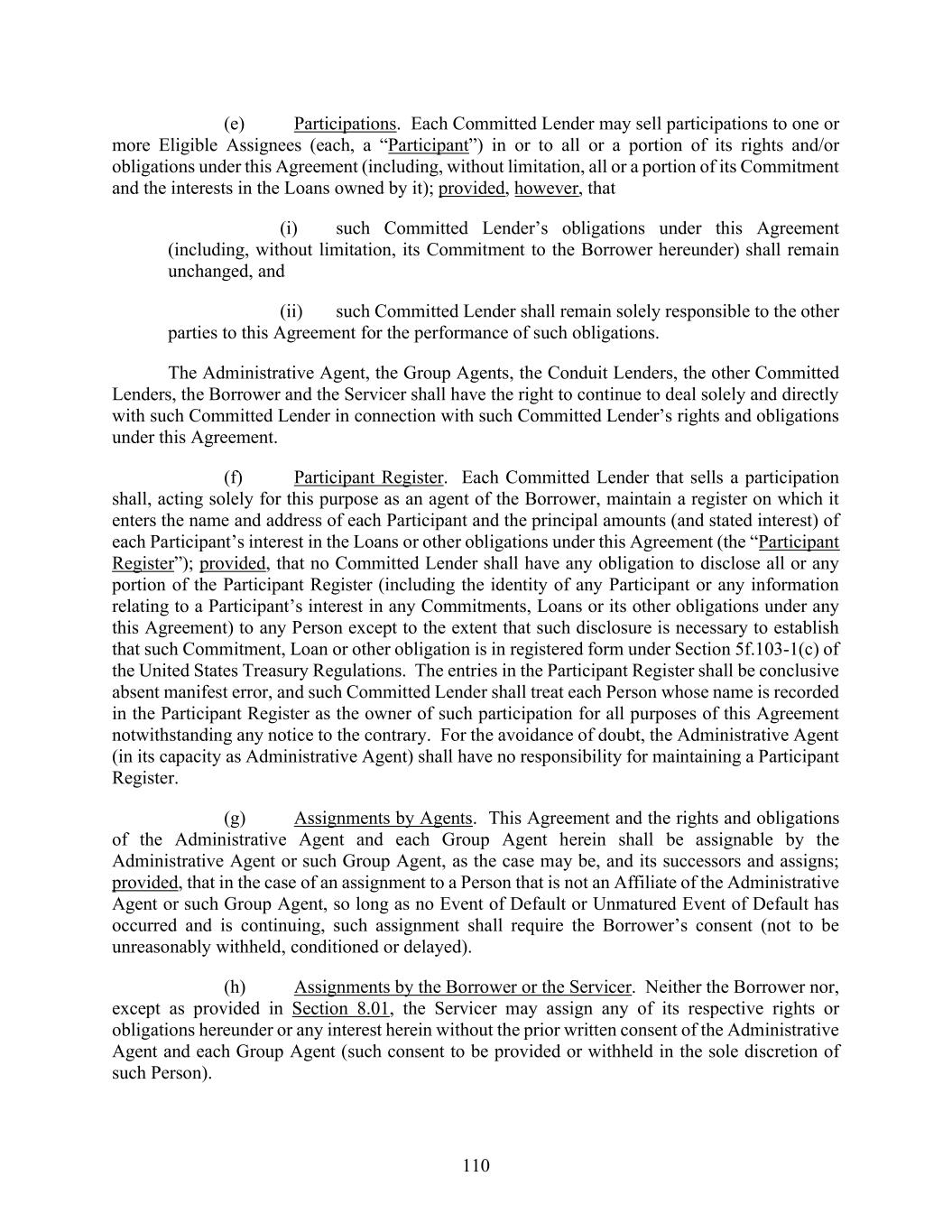 110 (e) Participations. Each Committed Lender may sell participations to one or more Eligible Assignees (each, a “Participant”) in or to all or a portion of its rights and/or obligations under this Agreement (including, without limitation, all or a portion of its Commitment and the interests in the Loans owned by it); provided, however, that (i) such Committed Lender’s obligations under this Agreement (including, without limitation, its Commitment to the Borrower hereunder) shall remain unchanged, and (ii) such Committed Lender shall remain solely responsible to the other parties to this Agreement for the performance of such obligations. The Administrative Agent, the Group Agents, the Conduit Lenders, the other Committed Lenders, the Borrower and the Servicer shall have the right to continue to deal solely and directly with such Committed Lender in connection with such Committed Lender’s rights and obligations under this Agreement. (f) Participant Register. Each Committed Lender that sells a participation shall, acting solely for this purpose as an agent of the Borrower, maintain a register on which it enters the name and address of each Participant and the principal amounts (and stated interest) of each Participant’s interest in the Loans or other obligations under this Agreement (the “Participant Register”); provided, that no Committed Lender shall have any obligation to disclose all or any portion of the Participant Register (including the identity of any Participant or any information relating to a Participant’s interest in any Commitments, Loans or its other obligations under any this Agreement) to any Person except to the extent that such disclosure is necessary to establish that such Commitment, Loan or other obligation is in registered form under Section 5f.103-1(c) of the United States Treasury Regulations. The entries in the Participant Register shall be conclusive absent manifest error, and such Committed Lender shall treat each Person whose name is recorded in the Participant Register as the owner of such participation for all purposes of this Agreement notwithstanding any notice to the contrary. For the avoidance of doubt, the Administrative Agent (in its capacity as Administrative Agent) shall have no responsibility for maintaining a Participant Register. (g) Assignments by Agents. This Agreement and the rights and obligations of the Administrative Agent and each Group Agent herein shall be assignable by the Administrative Agent or such Group Agent, as the case may be, and its successors and assigns; provided, that in the case of an assignment to a Person that is not an Affiliate of the Administrative Agent or such Group Agent, so long as no Event of Default or Unmatured Event of Default has occurred and is continuing, such assignment shall require the Borrower’s consent (not to be unreasonably withheld, conditioned or delayed). (h) Assignments by the Borrower or the Servicer. Neither the Borrower nor, except as provided in Section 8.01, the Servicer may assign any of its respective rights or obligations hereunder or any interest herein without the prior written consent of the Administrative Agent and each Group Agent (such consent to be provided or withheld in the sole discretion of such Person).