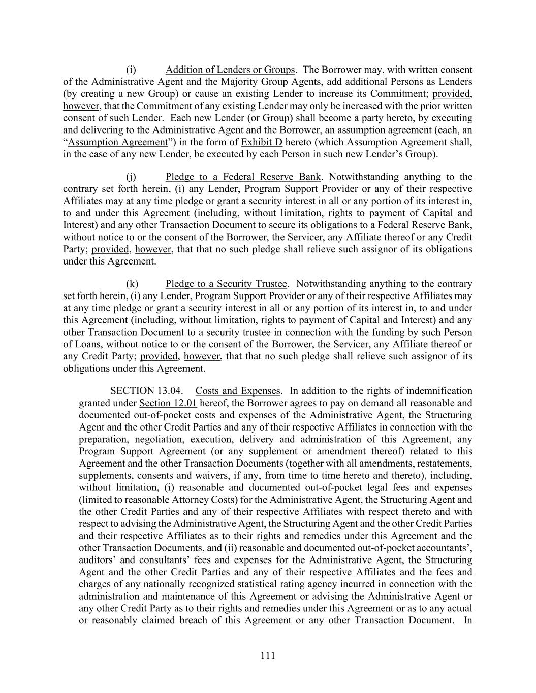 111 (i) Addition of Lenders or Groups. The Borrower may, with written consent of the Administrative Agent and the Majority Group Agents, add additional Persons as Lenders (by creating a new Group) or cause an existing Lender to increase its Commitment; provided, however, that the Commitment of any existing Lender may only be increased with the prior written consent of such Lender. Each new Lender (or Group) shall become a party hereto, by executing and delivering to the Administrative Agent and the Borrower, an assumption agreement (each, an “Assumption Agreement”) in the form of Exhibit D hereto (which Assumption Agreement shall, in the case of any new Lender, be executed by each Person in such new Lender’s Group). (j) Pledge to a Federal Reserve Bank. Notwithstanding anything to the contrary set forth herein, (i) any Lender, Program Support Provider or any of their respective Affiliates may at any time pledge or grant a security interest in all or any portion of its interest in, to and under this Agreement (including, without limitation, rights to payment of Capital and Interest) and any other Transaction Document to secure its obligations to a Federal Reserve Bank, without notice to or the consent of the Borrower, the Servicer, any Affiliate thereof or any Credit Party; provided, however, that that no such pledge shall relieve such assignor of its obligations under this Agreement. (k) Pledge to a Security Trustee. Notwithstanding anything to the contrary set forth herein, (i) any Lender, Program Support Provider or any of their respective Affiliates may at any time pledge or grant a security interest in all or any portion of its interest in, to and under this Agreement (including, without limitation, rights to payment of Capital and Interest) and any other Transaction Document to a security trustee in connection with the funding by such Person of Loans, without notice to or the consent of the Borrower, the Servicer, any Affiliate thereof or any Credit Party; provided, however, that that no such pledge shall relieve such assignor of its obligations under this Agreement. SECTION 13.04. Costs and Expenses. In addition to the rights of indemnification granted under Section 12.01 hereof, the Borrower agrees to pay on demand all reasonable and documented out-of-pocket costs and expenses of the Administrative Agent, the Structuring Agent and the other Credit Parties and any of their respective Affiliates in connection with the preparation, negotiation, execution, delivery and administration of this Agreement, any Program Support Agreement (or any supplement or amendment thereof) related to this Agreement and the other Transaction Documents (together with all amendments, restatements, supplements, consents and waivers, if any, from time to time hereto and thereto), including, without limitation, (i) reasonable and documented out-of-pocket legal fees and expenses (limited to reasonable Attorney Costs) for the Administrative Agent, the Structuring Agent and the other Credit Parties and any of their respective Affiliates with respect thereto and with respect to advising the Administrative Agent, the Structuring Agent and the other Credit Parties and their respective Affiliates as to their rights and remedies under this Agreement and the other Transaction Documents, and (ii) reasonable and documented out-of-pocket accountants’, auditors’ and consultants’ fees and expenses for the Administrative Agent, the Structuring Agent and the other Credit Parties and any of their respective Affiliates and the fees and charges of any nationally recognized statistical rating agency incurred in connection with the administration and maintenance of this Agreement or advising the Administrative Agent or any other Credit Party as to their rights and remedies under this Agreement or as to any actual or reasonably claimed breach of this Agreement or any other Transaction Document. In