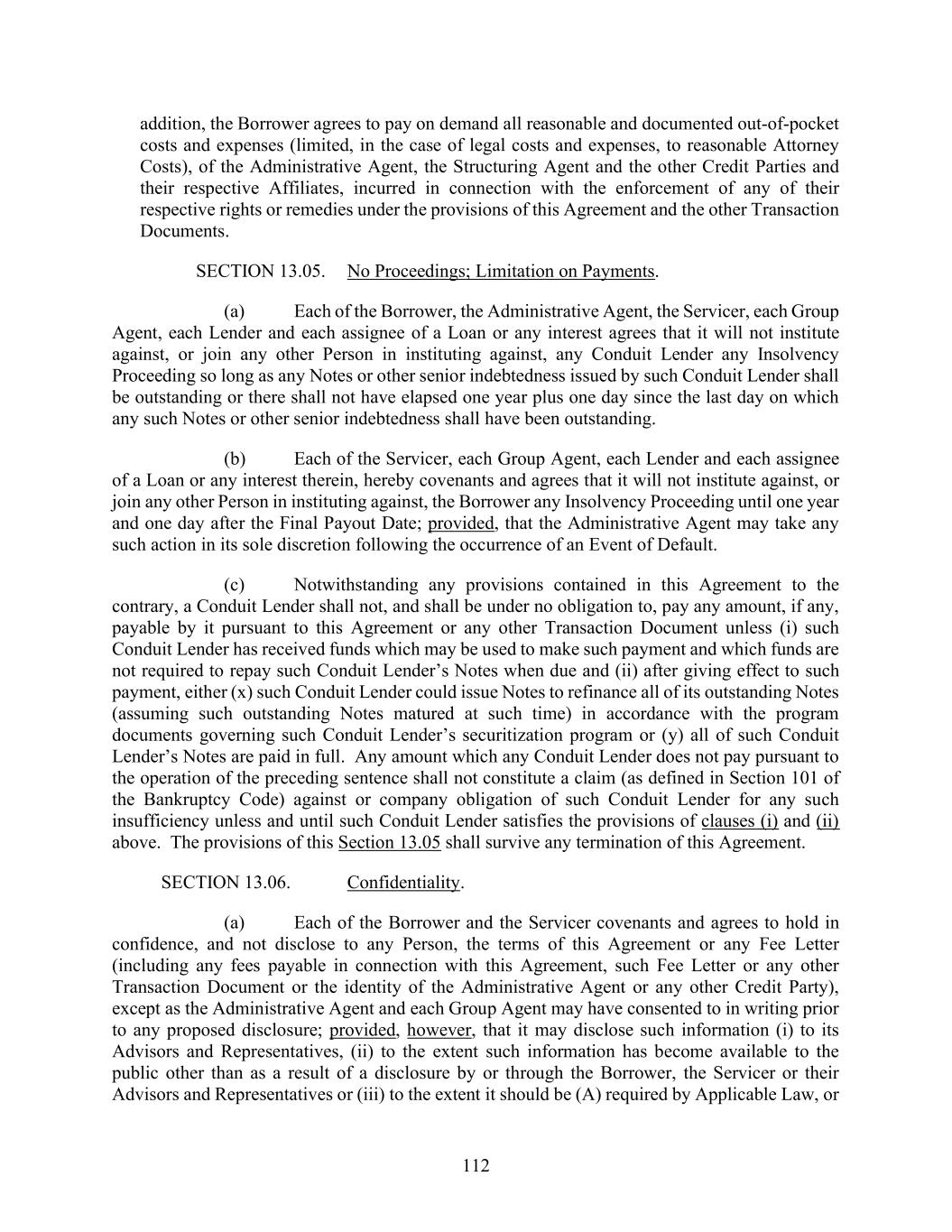 112 addition, the Borrower agrees to pay on demand all reasonable and documented out-of-pocket costs and expenses (limited, in the case of legal costs and expenses, to reasonable Attorney Costs), of the Administrative Agent, the Structuring Agent and the other Credit Parties and their respective Affiliates, incurred in connection with the enforcement of any of their respective rights or remedies under the provisions of this Agreement and the other Transaction Documents. SECTION 13.05. No Proceedings; Limitation on Payments. (a) Each of the Borrower, the Administrative Agent, the Servicer, each Group Agent, each Lender and each assignee of a Loan or any interest agrees that it will not institute against, or join any other Person in instituting against, any Conduit Lender any Insolvency Proceeding so long as any Notes or other senior indebtedness issued by such Conduit Lender shall be outstanding or there shall not have elapsed one year plus one day since the last day on which any such Notes or other senior indebtedness shall have been outstanding. (b) Each of the Servicer, each Group Agent, each Lender and each assignee of a Loan or any interest therein, hereby covenants and agrees that it will not institute against, or join any other Person in instituting against, the Borrower any Insolvency Proceeding until one year and one day after the Final Payout Date; provided, that the Administrative Agent may take any such action in its sole discretion following the occurrence of an Event of Default. (c) Notwithstanding any provisions contained in this Agreement to the contrary, a Conduit Lender shall not, and shall be under no obligation to, pay any amount, if any, payable by it pursuant to this Agreement or any other Transaction Document unless (i) such Conduit Lender has received funds which may be used to make such payment and which funds are not required to repay such Conduit Lender’s Notes when due and (ii) after giving effect to such payment, either (x) such Conduit Lender could issue Notes to refinance all of its outstanding Notes (assuming such outstanding Notes matured at such time) in accordance with the program documents governing such Conduit Lender’s securitization program or (y) all of such Conduit Lender’s Notes are paid in full. Any amount which any Conduit Lender does not pay pursuant to the operation of the preceding sentence shall not constitute a claim (as defined in Section 101 of the Bankruptcy Code) against or company obligation of such Conduit Lender for any such insufficiency unless and until such Conduit Lender satisfies the provisions of clauses (i) and (ii) above. The provisions of this Section 13.05 shall survive any termination of this Agreement. SECTION 13.06. Confidentiality. (a) Each of the Borrower and the Servicer covenants and agrees to hold in confidence, and not disclose to any Person, the terms of this Agreement or any Fee Letter (including any fees payable in connection with this Agreement, such Fee Letter or any other Transaction Document or the identity of the Administrative Agent or any other Credit Party), except as the Administrative Agent and each Group Agent may have consented to in writing prior to any proposed disclosure; provided, however, that it may disclose such information (i) to its Advisors and Representatives, (ii) to the extent such information has become available to the public other than as a result of a disclosure by or through the Borrower, the Servicer or their Advisors and Representatives or (iii) to the extent it should be (A) required by Applicable Law, or