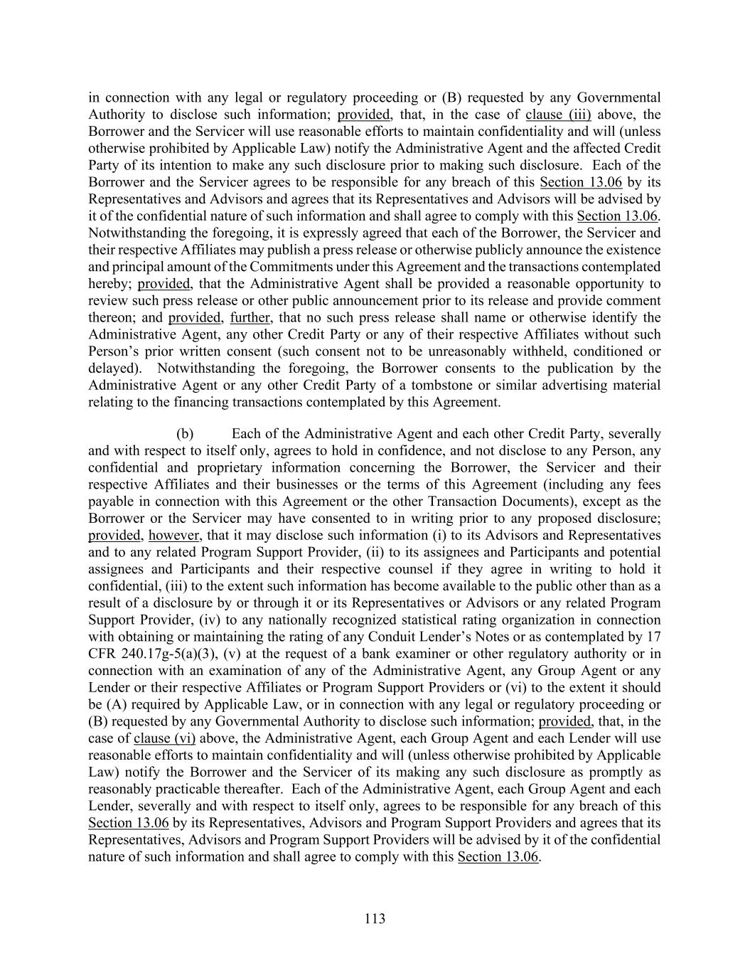 113 in connection with any legal or regulatory proceeding or (B) requested by any Governmental Authority to disclose such information; provided, that, in the case of clause (iii) above, the Borrower and the Servicer will use reasonable efforts to maintain confidentiality and will (unless otherwise prohibited by Applicable Law) notify the Administrative Agent and the affected Credit Party of its intention to make any such disclosure prior to making such disclosure. Each of the Borrower and the Servicer agrees to be responsible for any breach of this Section 13.06 by its Representatives and Advisors and agrees that its Representatives and Advisors will be advised by it of the confidential nature of such information and shall agree to comply with this Section 13.06. Notwithstanding the foregoing, it is expressly agreed that each of the Borrower, the Servicer and their respective Affiliates may publish a press release or otherwise publicly announce the existence and principal amount of the Commitments under this Agreement and the transactions contemplated hereby; provided, that the Administrative Agent shall be provided a reasonable opportunity to review such press release or other public announcement prior to its release and provide comment thereon; and provided, further, that no such press release shall name or otherwise identify the Administrative Agent, any other Credit Party or any of their respective Affiliates without such Person’s prior written consent (such consent not to be unreasonably withheld, conditioned or delayed). Notwithstanding the foregoing, the Borrower consents to the publication by the Administrative Agent or any other Credit Party of a tombstone or similar advertising material relating to the financing transactions contemplated by this Agreement. (b) Each of the Administrative Agent and each other Credit Party, severally and with respect to itself only, agrees to hold in confidence, and not disclose to any Person, any confidential and proprietary information concerning the Borrower, the Servicer and their respective Affiliates and their businesses or the terms of this Agreement (including any fees payable in connection with this Agreement or the other Transaction Documents), except as the Borrower or the Servicer may have consented to in writing prior to any proposed disclosure; provided, however, that it may disclose such information (i) to its Advisors and Representatives and to any related Program Support Provider, (ii) to its assignees and Participants and potential assignees and Participants and their respective counsel if they agree in writing to hold it confidential, (iii) to the extent such information has become available to the public other than as a result of a disclosure by or through it or its Representatives or Advisors or any related Program Support Provider, (iv) to any nationally recognized statistical rating organization in connection with obtaining or maintaining the rating of any Conduit Lender’s Notes or as contemplated by 17 CFR 240.17g-5(a)(3), (v) at the request of a bank examiner or other regulatory authority or in connection with an examination of any of the Administrative Agent, any Group Agent or any Lender or their respective Affiliates or Program Support Providers or (vi) to the extent it should be (A) required by Applicable Law, or in connection with any legal or regulatory proceeding or (B) requested by any Governmental Authority to disclose such information; provided, that, in the case of clause (vi) above, the Administrative Agent, each Group Agent and each Lender will use reasonable efforts to maintain confidentiality and will (unless otherwise prohibited by Applicable Law) notify the Borrower and the Servicer of its making any such disclosure as promptly as reasonably practicable thereafter. Each of the Administrative Agent, each Group Agent and each Lender, severally and with respect to itself only, agrees to be responsible for any breach of this Section 13.06 by its Representatives, Advisors and Program Support Providers and agrees that its Representatives, Advisors and Program Support Providers will be advised by it of the confidential nature of such information and shall agree to comply with this Section 13.06.