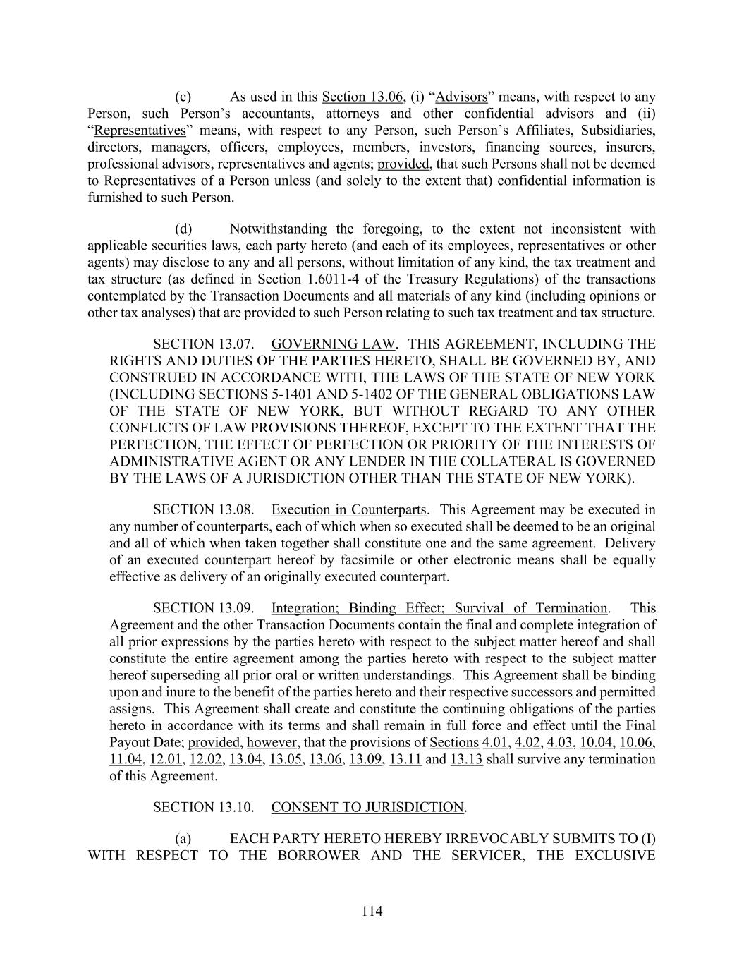 114 (c) As used in this Section 13.06, (i) “Advisors” means, with respect to any Person, such Person’s accountants, attorneys and other confidential advisors and (ii) “Representatives” means, with respect to any Person, such Person’s Affiliates, Subsidiaries, directors, managers, officers, employees, members, investors, financing sources, insurers, professional advisors, representatives and agents; provided, that such Persons shall not be deemed to Representatives of a Person unless (and solely to the extent that) confidential information is furnished to such Person. (d) Notwithstanding the foregoing, to the extent not inconsistent with applicable securities laws, each party hereto (and each of its employees, representatives or other agents) may disclose to any and all persons, without limitation of any kind, the tax treatment and tax structure (as defined in Section 1.6011-4 of the Treasury Regulations) of the transactions contemplated by the Transaction Documents and all materials of any kind (including opinions or other tax analyses) that are provided to such Person relating to such tax treatment and tax structure. SECTION 13.07. GOVERNING LAW. THIS AGREEMENT, INCLUDING THE RIGHTS AND DUTIES OF THE PARTIES HERETO, SHALL BE GOVERNED BY, AND CONSTRUED IN ACCORDANCE WITH, THE LAWS OF THE STATE OF NEW YORK (INCLUDING SECTIONS 5-1401 AND 5-1402 OF THE GENERAL OBLIGATIONS LAW OF THE STATE OF NEW YORK, BUT WITHOUT REGARD TO ANY OTHER CONFLICTS OF LAW PROVISIONS THEREOF, EXCEPT TO THE EXTENT THAT THE PERFECTION, THE EFFECT OF PERFECTION OR PRIORITY OF THE INTERESTS OF ADMINISTRATIVE AGENT OR ANY LENDER IN THE COLLATERAL IS GOVERNED BY THE LAWS OF A JURISDICTION OTHER THAN THE STATE OF NEW YORK). SECTION 13.08. Execution in Counterparts. This Agreement may be executed in any number of counterparts, each of which when so executed shall be deemed to be an original and all of which when taken together shall constitute one and the same agreement. Delivery of an executed counterpart hereof by facsimile or other electronic means shall be equally effective as delivery of an originally executed counterpart. SECTION 13.09. Integration; Binding Effect; Survival of Termination. This Agreement and the other Transaction Documents contain the final and complete integration of all prior expressions by the parties hereto with respect to the subject matter hereof and shall constitute the entire agreement among the parties hereto with respect to the subject matter hereof superseding all prior oral or written understandings. This Agreement shall be binding upon and inure to the benefit of the parties hereto and their respective successors and permitted assigns. This Agreement shall create and constitute the continuing obligations of the parties hereto in accordance with its terms and shall remain in full force and effect until the Final Payout Date; provided, however, that the provisions of Sections 4.01, 4.02, 4.03, 10.04, 10.06, 11.04, 12.01, 12.02, 13.04, 13.05, 13.06, 13.09, 13.11 and 13.13 shall survive any termination of this Agreement. SECTION 13.10. CONSENT TO JURISDICTION. (a) EACH PARTY HERETO HEREBY IRREVOCABLY SUBMITS TO (I) WITH RESPECT TO THE BORROWER AND THE SERVICER, THE EXCLUSIVE