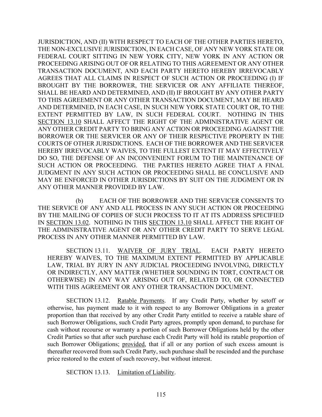 115 JURISDICTION, AND (II) WITH RESPECT TO EACH OF THE OTHER PARTIES HERETO, THE NON-EXCLUSIVE JURISDICTION, IN EACH CASE, OF ANY NEW YORK STATE OR FEDERAL COURT SITTING IN NEW YORK CITY, NEW YORK IN ANY ACTION OR PROCEEDING ARISING OUT OF OR RELATING TO THIS AGREEMENT OR ANY OTHER TRANSACTION DOCUMENT, AND EACH PARTY HERETO HEREBY IRREVOCABLY AGREES THAT ALL CLAIMS IN RESPECT OF SUCH ACTION OR PROCEEDING (I) IF BROUGHT BY THE BORROWER, THE SERVICER OR ANY AFFILIATE THEREOF, SHALL BE HEARD AND DETERMINED, AND (II) IF BROUGHT BY ANY OTHER PARTY TO THIS AGREEMENT OR ANY OTHER TRANSACTION DOCUMENT, MAY BE HEARD AND DETERMINED, IN EACH CASE, IN SUCH NEW YORK STATE COURT OR, TO THE EXTENT PERMITTED BY LAW, IN SUCH FEDERAL COURT. NOTHING IN THIS SECTION 13.10 SHALL AFFECT THE RIGHT OF THE ADMINISTRATIVE AGENT OR ANY OTHER CREDIT PARTY TO BRING ANY ACTION OR PROCEEDING AGAINST THE BORROWER OR THE SERVICER OR ANY OF THEIR RESPECTIVE PROPERTY IN THE COURTS OF OTHER JURISDICTIONS. EACH OF THE BORROWER AND THE SERVICER HEREBY IRREVOCABLY WAIVES, TO THE FULLEST EXTENT IT MAY EFFECTIVELY DO SO, THE DEFENSE OF AN INCONVENIENT FORUM TO THE MAINTENANCE OF SUCH ACTION OR PROCEEDING. THE PARTIES HERETO AGREE THAT A FINAL JUDGMENT IN ANY SUCH ACTION OR PROCEEDING SHALL BE CONCLUSIVE AND MAY BE ENFORCED IN OTHER JURISDICTIONS BY SUIT ON THE JUDGMENT OR IN ANY OTHER MANNER PROVIDED BY LAW. (b) EACH OF THE BORROWER AND THE SERVICER CONSENTS TO THE SERVICE OF ANY AND ALL PROCESS IN ANY SUCH ACTION OR PROCEEDING BY THE MAILING OF COPIES OF SUCH PROCESS TO IT AT ITS ADDRESS SPECIFIED IN SECTION 13.02. NOTHING IN THIS SECTION 13.10 SHALL AFFECT THE RIGHT OF THE ADMINISTRATIVE AGENT OR ANY OTHER CREDIT PARTY TO SERVE LEGAL PROCESS IN ANY OTHER MANNER PERMITTED BY LAW. SECTION 13.11. WAIVER OF JURY TRIAL. EACH PARTY HERETO HEREBY WAIVES, TO THE MAXIMUM EXTENT PERMITTED BY APPLICABLE LAW, TRIAL BY JURY IN ANY JUDICIAL PROCEEDING INVOLVING, DIRECTLY OR INDIRECTLY, ANY MATTER (WHETHER SOUNDING IN TORT, CONTRACT OR OTHERWISE) IN ANY WAY ARISING OUT OF, RELATED TO, OR CONNECTED WITH THIS AGREEMENT OR ANY OTHER TRANSACTION DOCUMENT. SECTION 13.12. Ratable Payments. If any Credit Party, whether by setoff or otherwise, has payment made to it with respect to any Borrower Obligations in a greater proportion than that received by any other Credit Party entitled to receive a ratable share of such Borrower Obligations, such Credit Party agrees, promptly upon demand, to purchase for cash without recourse or warranty a portion of such Borrower Obligations held by the other Credit Parties so that after such purchase each Credit Party will hold its ratable proportion of such Borrower Obligations; provided, that if all or any portion of such excess amount is thereafter recovered from such Credit Party, such purchase shall be rescinded and the purchase price restored to the extent of such recovery, but without interest. SECTION 13.13. Limitation of Liability.