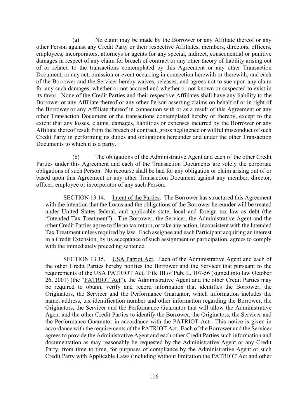 116 (a) No claim may be made by the Borrower or any Affiliate thereof or any other Person against any Credit Party or their respective Affiliates, members, directors, officers, employees, incorporators, attorneys or agents for any special, indirect, consequential or punitive damages in respect of any claim for breach of contract or any other theory of liability arising out of or related to the transactions contemplated by this Agreement or any other Transaction Document, or any act, omission or event occurring in connection herewith or therewith; and each of the Borrower and the Servicer hereby waives, releases, and agrees not to sue upon any claim for any such damages, whether or not accrued and whether or not known or suspected to exist in its favor. None of the Credit Parties and their respective Affiliates shall have any liability to the Borrower or any Affiliate thereof or any other Person asserting claims on behalf of or in right of the Borrower or any Affiliate thereof in connection with or as a result of this Agreement or any other Transaction Document or the transactions contemplated hereby or thereby, except to the extent that any losses, claims, damages, liabilities or expenses incurred by the Borrower or any Affiliate thereof result from the breach of contract, gross negligence or willful misconduct of such Credit Party in performing its duties and obligations hereunder and under the other Transaction Documents to which it is a party. (b) The obligations of the Administrative Agent and each of the other Credit Parties under this Agreement and each of the Transaction Documents are solely the corporate obligations of such Person. No recourse shall be had for any obligation or claim arising out of or based upon this Agreement or any other Transaction Document against any member, director, officer, employee or incorporator of any such Person. SECTION 13.14. Intent of the Parties. The Borrower has structured this Agreement with the intention that the Loans and the obligations of the Borrower hereunder will be treated under United States federal, and applicable state, local and foreign tax law as debt (the “Intended Tax Treatment”). The Borrower, the Servicer, the Administrative Agent and the other Credit Parties agree to file no tax return, or take any action, inconsistent with the Intended Tax Treatment unless required by law. Each assignee and each Participant acquiring an interest in a Credit Extension, by its acceptance of such assignment or participation, agrees to comply with the immediately preceding sentence. SECTION 13.15. USA Patriot Act. Each of the Administrative Agent and each of the other Credit Parties hereby notifies the Borrower and the Servicer that pursuant to the requirements of the USA PATRIOT Act, Title III of Pub. L. 107-56 (signed into law October 26, 2001) (the “PATRIOT Act”), the Administrative Agent and the other Credit Parties may be required to obtain, verify and record information that identifies the Borrower, the Originators, the Servicer and the Performance Guarantor, which information includes the name, address, tax identification number and other information regarding the Borrower, the Originators, the Servicer and the Performance Guarantor that will allow the Administrative Agent and the other Credit Parties to identify the Borrower, the Originators, the Servicer and the Performance Guarantor in accordance with the PATRIOT Act. This notice is given in accordance with the requirements of the PATRIOT Act. Each of the Borrower and the Servicer agrees to provide the Administrative Agent and each other Credit Parties such information and documentation as may reasonably be requested by the Administrative Agent or any Credit Party, from time to time, for purposes of compliance by the Administrative Agent or such Credit Party with Applicable Laws (including without limitation the PATRIOT Act and other