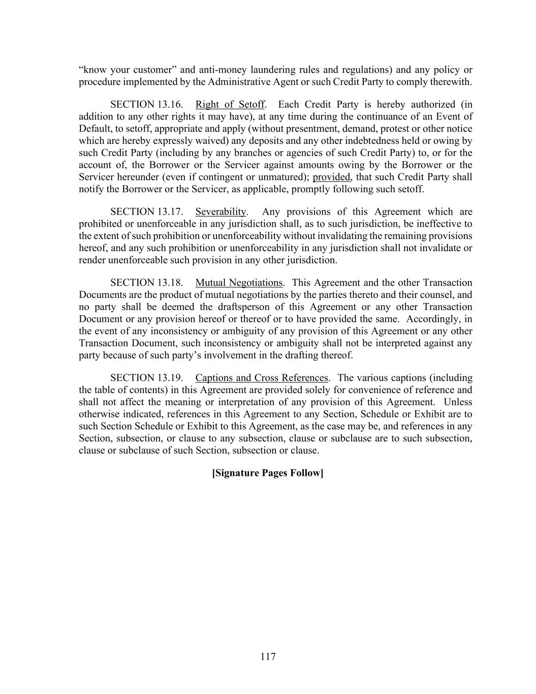117 “know your customer” and anti-money laundering rules and regulations) and any policy or procedure implemented by the Administrative Agent or such Credit Party to comply therewith. SECTION 13.16. Right of Setoff. Each Credit Party is hereby authorized (in addition to any other rights it may have), at any time during the continuance of an Event of Default, to setoff, appropriate and apply (without presentment, demand, protest or other notice which are hereby expressly waived) any deposits and any other indebtedness held or owing by such Credit Party (including by any branches or agencies of such Credit Party) to, or for the account of, the Borrower or the Servicer against amounts owing by the Borrower or the Servicer hereunder (even if contingent or unmatured); provided, that such Credit Party shall notify the Borrower or the Servicer, as applicable, promptly following such setoff. SECTION 13.17. Severability. Any provisions of this Agreement which are prohibited or unenforceable in any jurisdiction shall, as to such jurisdiction, be ineffective to the extent of such prohibition or unenforceability without invalidating the remaining provisions hereof, and any such prohibition or unenforceability in any jurisdiction shall not invalidate or render unenforceable such provision in any other jurisdiction. SECTION 13.18. Mutual Negotiations. This Agreement and the other Transaction Documents are the product of mutual negotiations by the parties thereto and their counsel, and no party shall be deemed the draftsperson of this Agreement or any other Transaction Document or any provision hereof or thereof or to have provided the same. Accordingly, in the event of any inconsistency or ambiguity of any provision of this Agreement or any other Transaction Document, such inconsistency or ambiguity shall not be interpreted against any party because of such party’s involvement in the drafting thereof. SECTION 13.19. Captions and Cross References. The various captions (including the table of contents) in this Agreement are provided solely for convenience of reference and shall not affect the meaning or interpretation of any provision of this Agreement. Unless otherwise indicated, references in this Agreement to any Section, Schedule or Exhibit are to such Section Schedule or Exhibit to this Agreement, as the case may be, and references in any Section, subsection, or clause to any subsection, clause or subclause are to such subsection, clause or subclause of such Section, subsection or clause. [Signature Pages Follow]