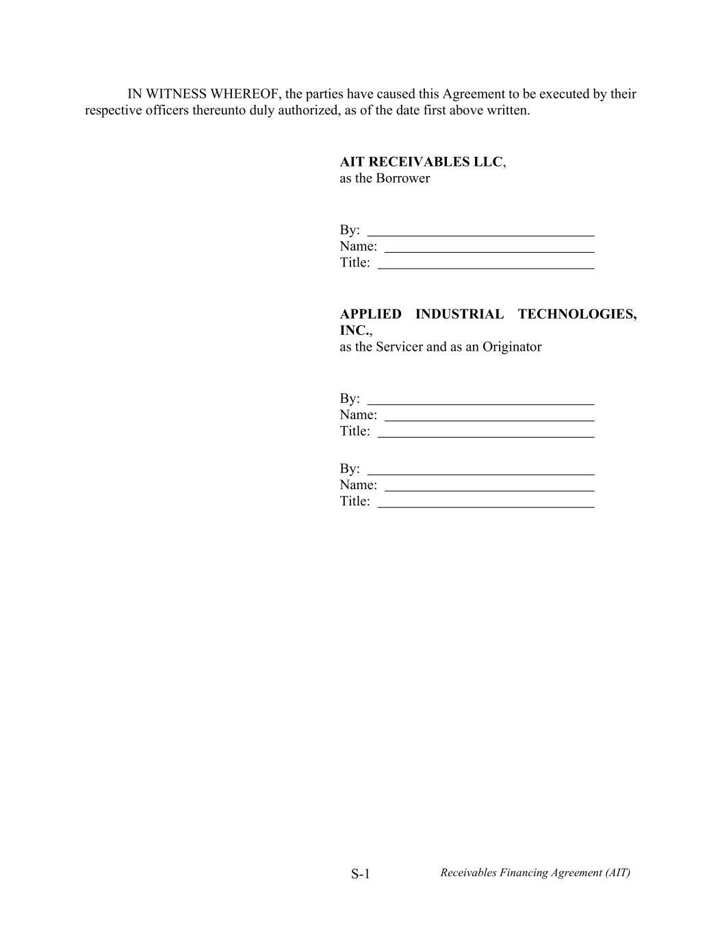 S-1 Receivables Financing Agreement (AIT) IN WITNESS WHEREOF, the parties have caused this Agreement to be executed by their respective officers thereunto duly authorized, as of the date first above written. AIT RECEIVABLES LLC, as the Borrower By: Name: Title: APPLIED INDUSTRIAL TECHNOLOGIES, INC., as the Servicer and as an Originator By: Name: Title: By: Name: Title: