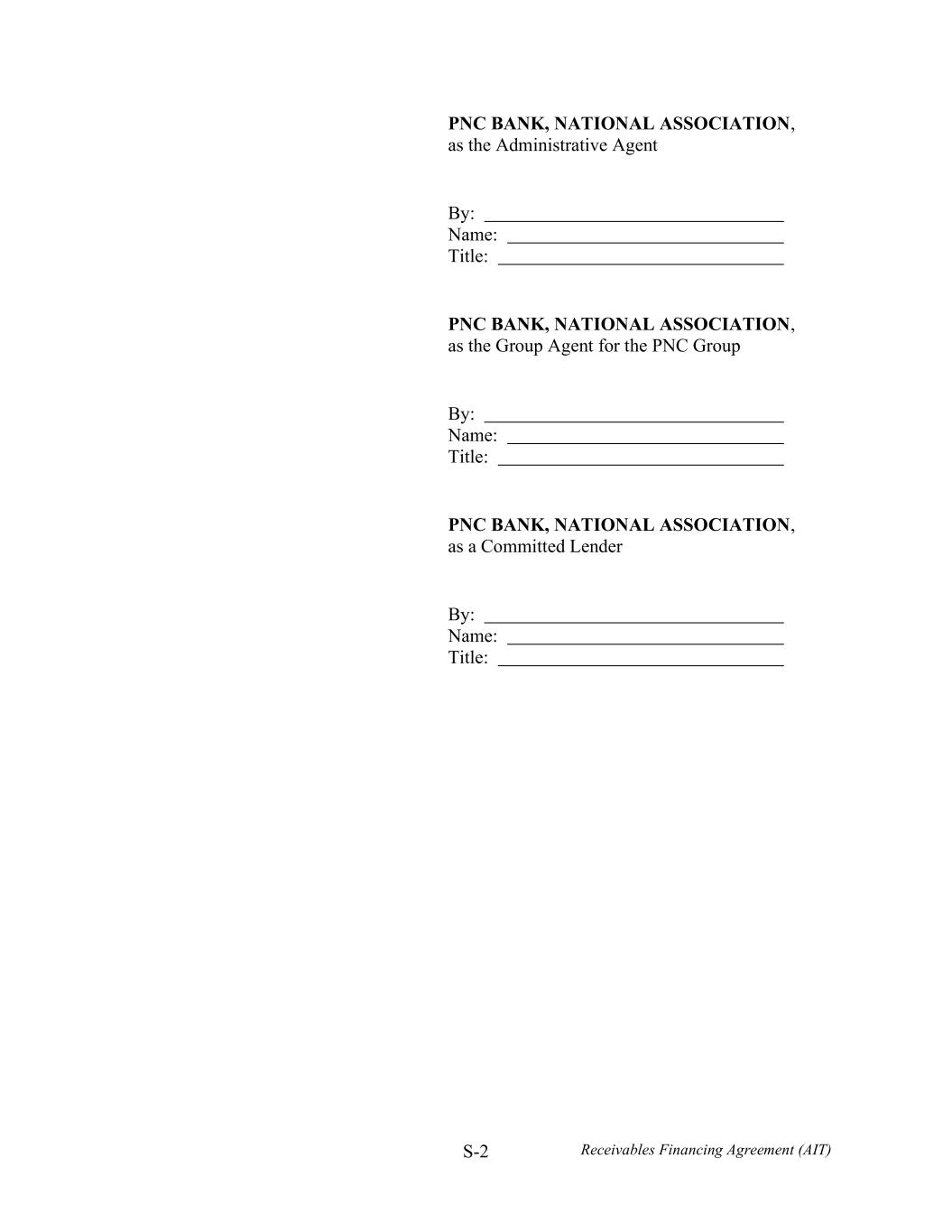 S-2 Receivables Financing Agreement (AIT) PNC BANK, NATIONAL ASSOCIATION, as the Administrative Agent By: Name: Title: PNC BANK, NATIONAL ASSOCIATION, as the Group Agent for the PNC Group By: Name: Title: PNC BANK, NATIONAL ASSOCIATION, as a Committed Lender By: Name: Title: