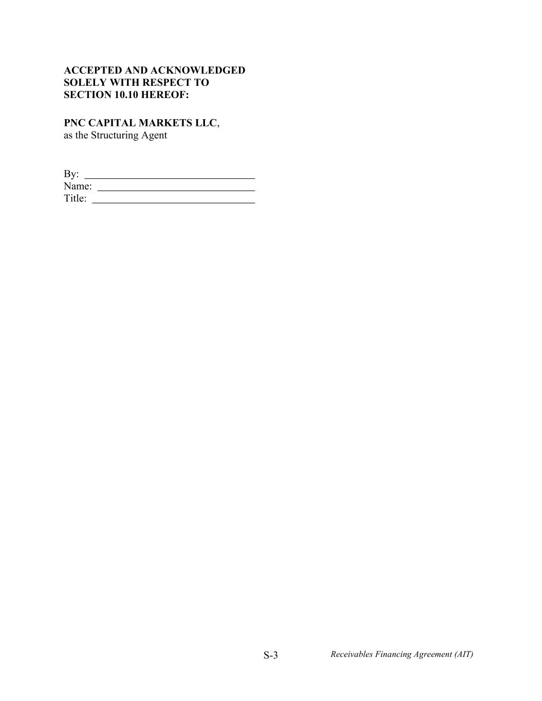S-3 Receivables Financing Agreement (AIT) ACCEPTED AND ACKNOWLEDGED SOLELY WITH RESPECT TO SECTION 10.10 HEREOF: PNC CAPITAL MARKETS LLC, as the Structuring Agent By: Name: Title:
