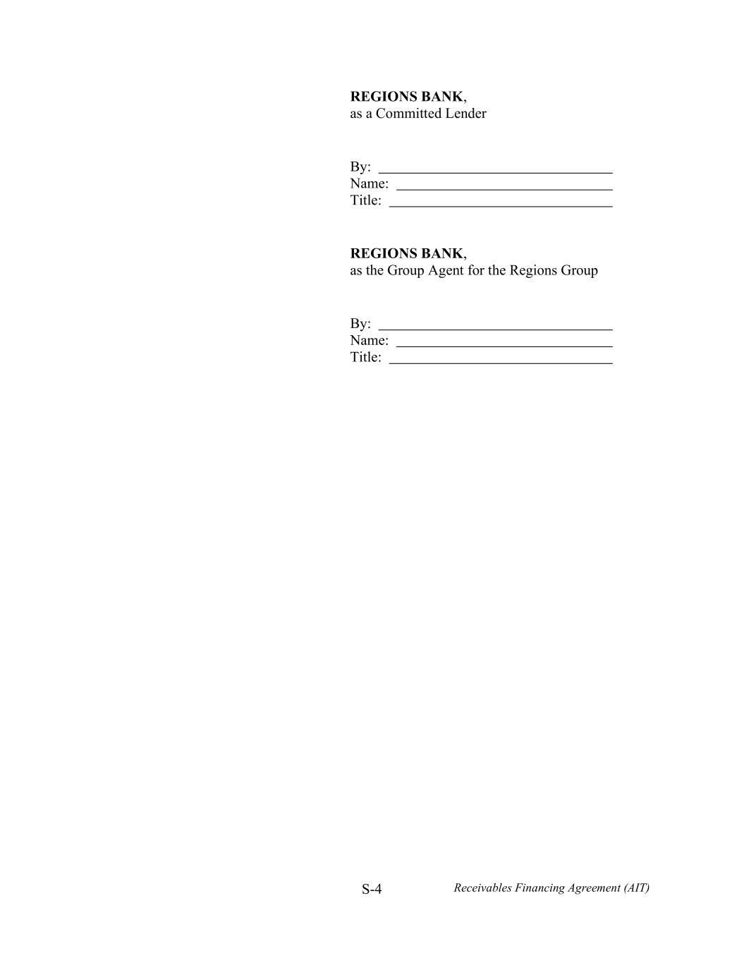 S-4 Receivables Financing Agreement (AIT) REGIONS BANK, as a Committed Lender By: Name: Title: REGIONS BANK, as the Group Agent for the Regions Group By: Name: Title: