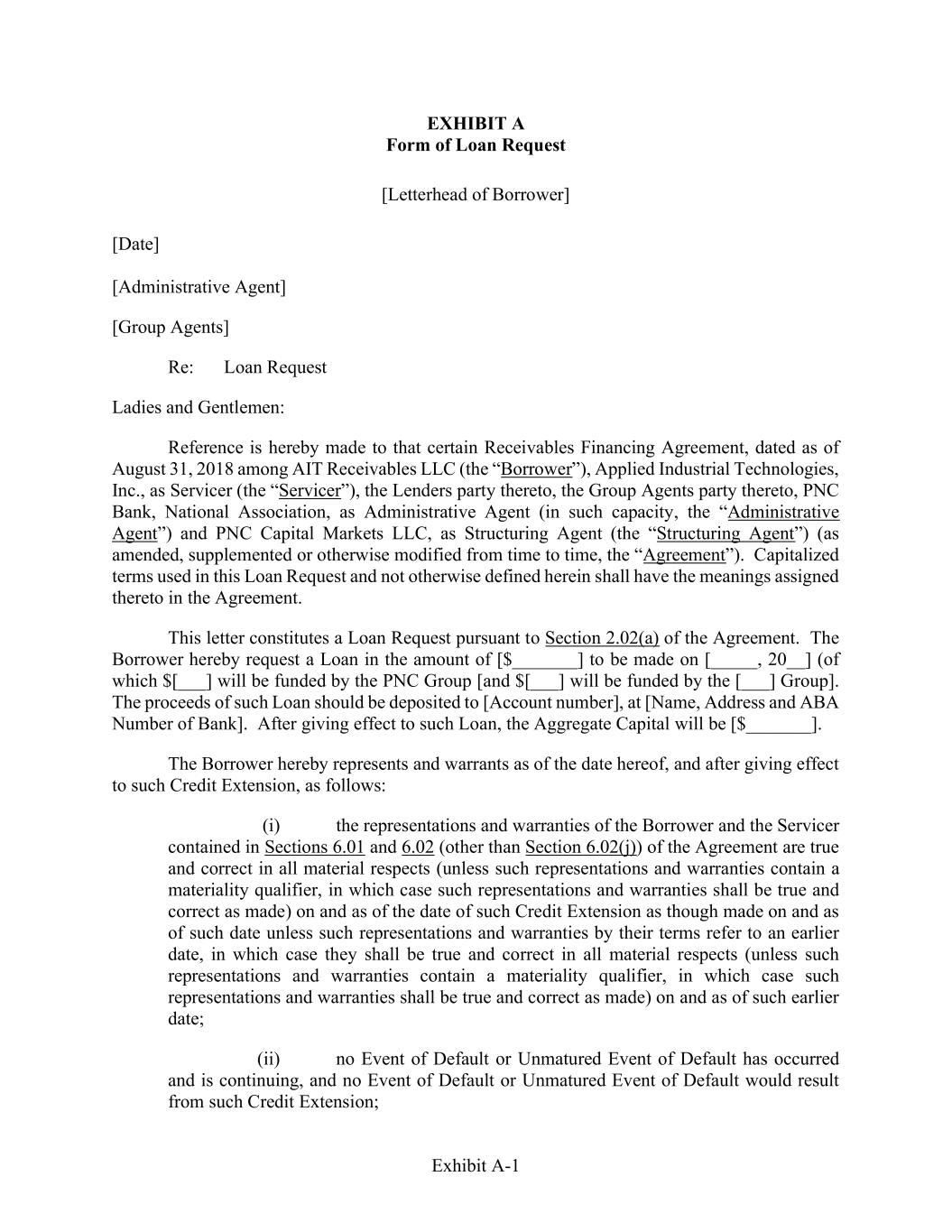 Exhibit A-1 EXHIBIT A Form of Loan Request [Letterhead of Borrower] [Date] [Administrative Agent] [Group Agents] Re: Loan Request Ladies and Gentlemen: Reference is hereby made to that certain Receivables Financing Agreement, dated as of August 31, 2018 among AIT Receivables LLC (the “Borrower”), Applied Industrial Technologies, Inc., as Servicer (the “Servicer”), the Lenders party thereto, the Group Agents party thereto, PNC Bank, National Association, as Administrative Agent (in such capacity, the “Administrative Agent”) and PNC Capital Markets LLC, as Structuring Agent (the “Structuring Agent”) (as amended, supplemented or otherwise modified from time to time, the “Agreement”). Capitalized terms used in this Loan Request and not otherwise defined herein shall have the meanings assigned thereto in the Agreement. This letter constitutes a Loan Request pursuant to Section 2.02(a) of the Agreement. The Borrower hereby request a Loan in the amount of [$_______] to be made on [_____, 20__] (of which $[___] will be funded by the PNC Group [and $[___] will be funded by the [___] Group]. The proceeds of such Loan should be deposited to [Account number], at [Name, Address and ABA Number of Bank]. After giving effect to such Loan, the Aggregate Capital will be [$_______]. The Borrower hereby represents and warrants as of the date hereof, and after giving effect to such Credit Extension, as follows: (i) the representations and warranties of the Borrower and the Servicer contained in Sections 6.01 and 6.02 (other than Section 6.02(j)) of the Agreement are true and correct in all material respects (unless such representations and warranties contain a materiality qualifier, in which case such representations and warranties shall be true and correct as made) on and as of the date of such Credit Extension as though made on and as of such date unless such representations and warranties by their terms refer to an earlier date, in which case they shall be true and correct in all material respects (unless such representations and warranties contain a materiality qualifier, in which case such representations and warranties shall be true and correct as made) on and as of such earlier date; (ii) no Event of Default or Unmatured Event of Default has occurred and is continuing, and no Event of Default or Unmatured Event of Default would result from such Credit Extension;