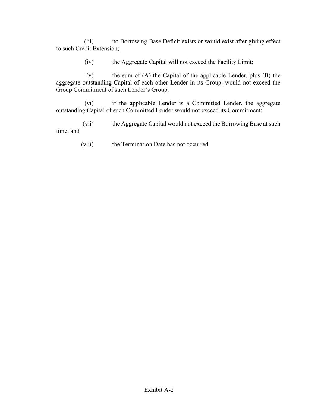 Exhibit A-2 (iii) no Borrowing Base Deficit exists or would exist after giving effect to such Credit Extension; (iv) the Aggregate Capital will not exceed the Facility Limit; (v) the sum of (A) the Capital of the applicable Lender, plus (B) the aggregate outstanding Capital of each other Lender in its Group, would not exceed the Group Commitment of such Lender’s Group; (vi) if the applicable Lender is a Committed Lender, the aggregate outstanding Capital of such Committed Lender would not exceed its Commitment; (vii) the Aggregate Capital would not exceed the Borrowing Base at such time; and (viii) the Termination Date has not occurred.