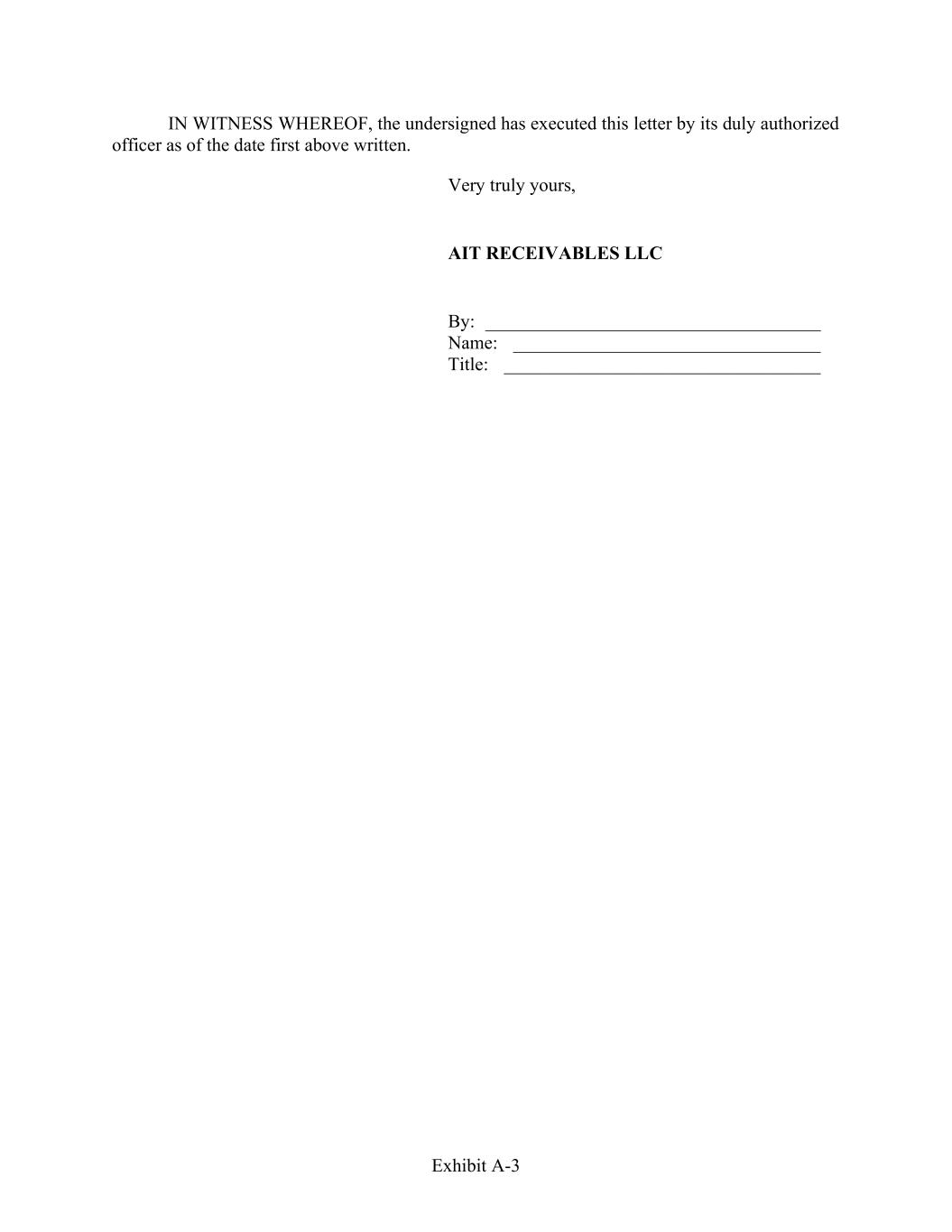 Exhibit A-3 IN WITNESS WHEREOF, the undersigned has executed this letter by its duly authorized officer as of the date first above written. Very truly yours, AIT RECEIVABLES LLC By: ____________________________________ Name: _________________________________ Title: __________________________________