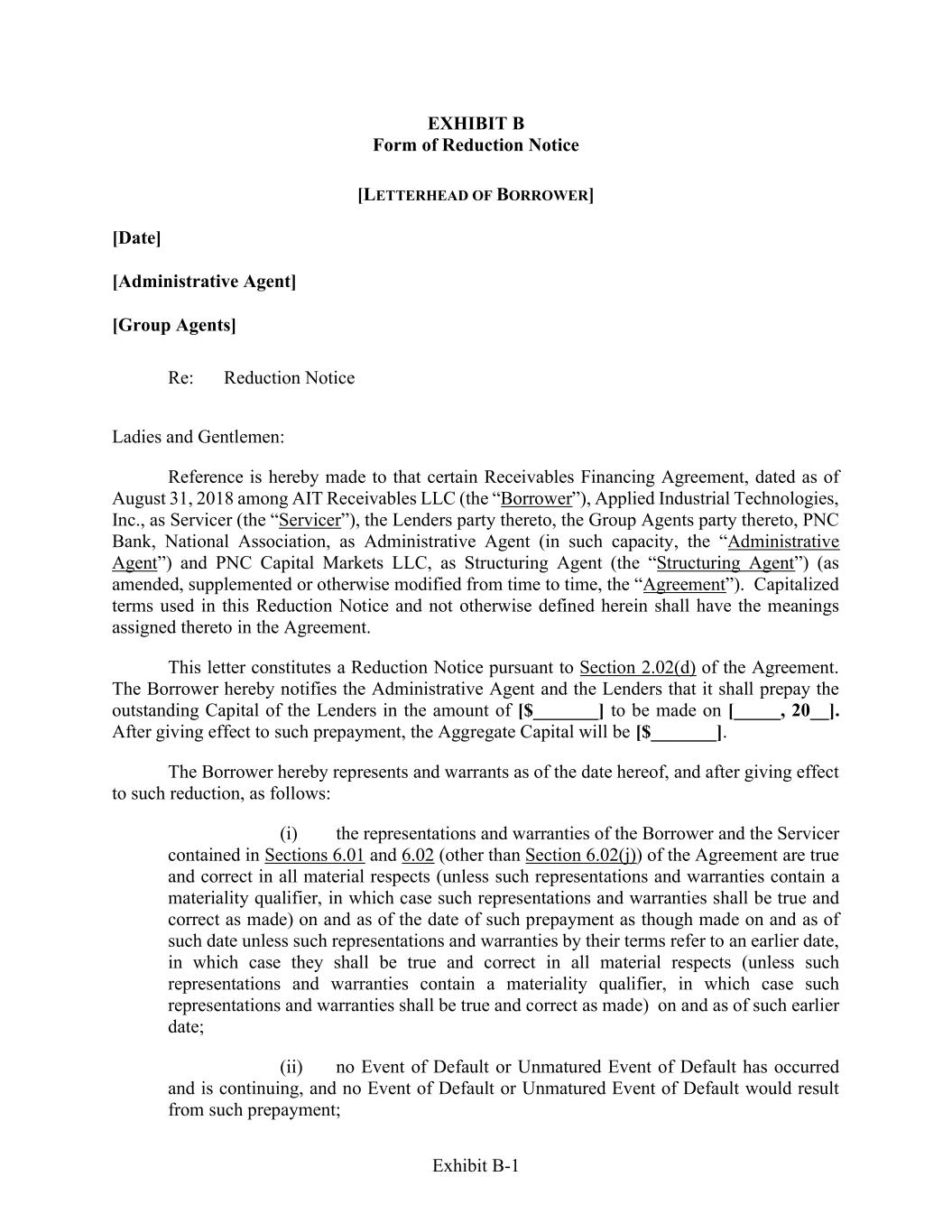 Exhibit B-1 EXHIBIT B Form of Reduction Notice [LETTERHEAD OF BORROWER] [Date] [Administrative Agent] [Group Agents] Re: Reduction Notice Ladies and Gentlemen: Reference is hereby made to that certain Receivables Financing Agreement, dated as of August 31, 2018 among AIT Receivables LLC (the “Borrower”), Applied Industrial Technologies, Inc., as Servicer (the “Servicer”), the Lenders party thereto, the Group Agents party thereto, PNC Bank, National Association, as Administrative Agent (in such capacity, the “Administrative Agent”) and PNC Capital Markets LLC, as Structuring Agent (the “Structuring Agent”) (as amended, supplemented or otherwise modified from time to time, the “Agreement”). Capitalized terms used in this Reduction Notice and not otherwise defined herein shall have the meanings assigned thereto in the Agreement. This letter constitutes a Reduction Notice pursuant to Section 2.02(d) of the Agreement. The Borrower hereby notifies the Administrative Agent and the Lenders that it shall prepay the outstanding Capital of the Lenders in the amount of [$_______] to be made on [_____, 20__]. After giving effect to such prepayment, the Aggregate Capital will be [$_______]. The Borrower hereby represents and warrants as of the date hereof, and after giving effect to such reduction, as follows: (i) the representations and warranties of the Borrower and the Servicer contained in Sections 6.01 and 6.02 (other than Section 6.02(j)) of the Agreement are true and correct in all material respects (unless such representations and warranties contain a materiality qualifier, in which case such representations and warranties shall be true and correct as made) on and as of the date of such prepayment as though made on and as of such date unless such representations and warranties by their terms refer to an earlier date, in which case they shall be true and correct in all material respects (unless such representations and warranties contain a materiality qualifier, in which case such representations and warranties shall be true and correct as made) on and as of such earlier date; (ii) no Event of Default or Unmatured Event of Default has occurred and is continuing, and no Event of Default or Unmatured Event of Default would result from such prepayment;
