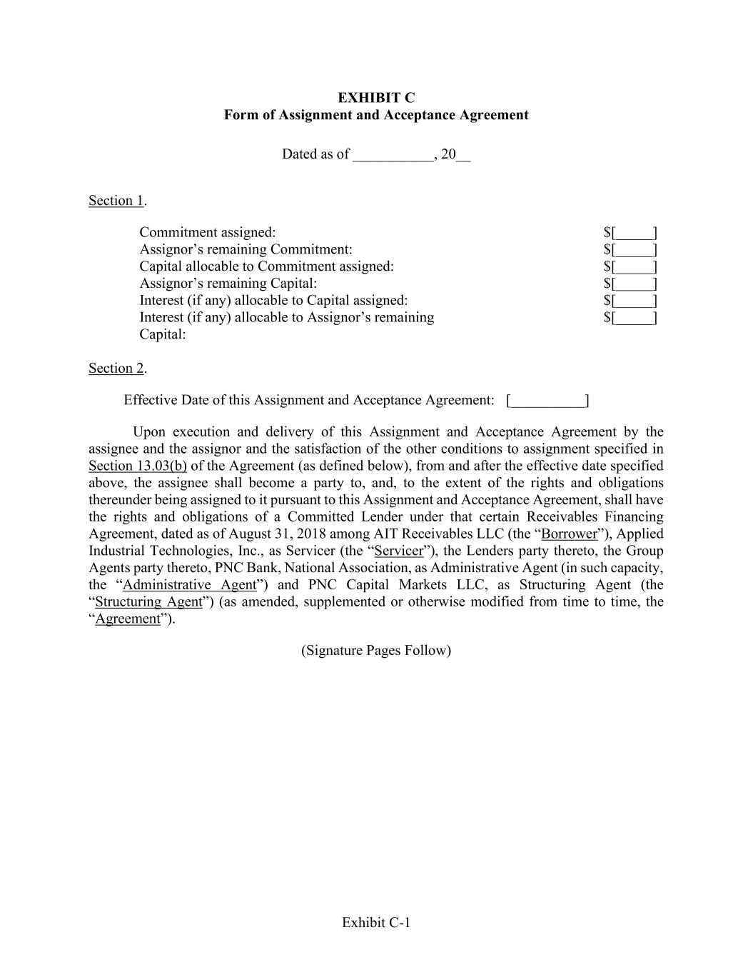 Exhibit C-1 EXHIBIT C Form of Assignment and Acceptance Agreement Dated as of ___________, 20__ Section 1. Commitment assigned: $[_____] Assignor’s remaining Commitment: $[_____] Capital allocable to Commitment assigned: $[_____] Assignor’s remaining Capital: $[_____] Interest (if any) allocable to Capital assigned: $[_____] Interest (if any) allocable to Assignor’s remaining Capital: $[_____] Section 2. Effective Date of this Assignment and Acceptance Agreement: [__________] Upon execution and delivery of this Assignment and Acceptance Agreement by the assignee and the assignor and the satisfaction of the other conditions to assignment specified in Section 13.03(b) of the Agreement (as defined below), from and after the effective date specified above, the assignee shall become a party to, and, to the extent of the rights and obligations thereunder being assigned to it pursuant to this Assignment and Acceptance Agreement, shall have the rights and obligations of a Committed Lender under that certain Receivables Financing Agreement, dated as of August 31, 2018 among AIT Receivables LLC (the “Borrower”), Applied Industrial Technologies, Inc., as Servicer (the “Servicer”), the Lenders party thereto, the Group Agents party thereto, PNC Bank, National Association, as Administrative Agent (in such capacity, the “Administrative Agent”) and PNC Capital Markets LLC, as Structuring Agent (the “Structuring Agent”) (as amended, supplemented or otherwise modified from time to time, the “Agreement”). (Signature Pages Follow)