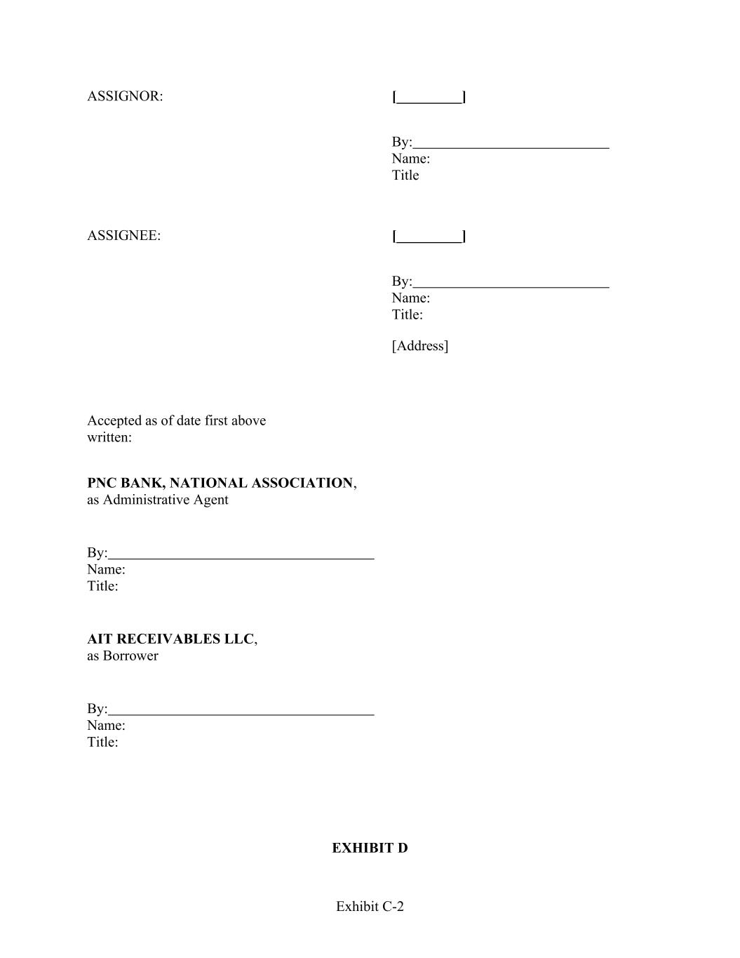Exhibit C-2 ASSIGNOR: [_________] By: Name: Title ASSIGNEE: [_________] By: Name: Title: [Address] Accepted as of date first above written: PNC BANK, NATIONAL ASSOCIATION, as Administrative Agent By: Name: Title: AIT RECEIVABLES LLC, as Borrower By: Name: Title: EXHIBIT D