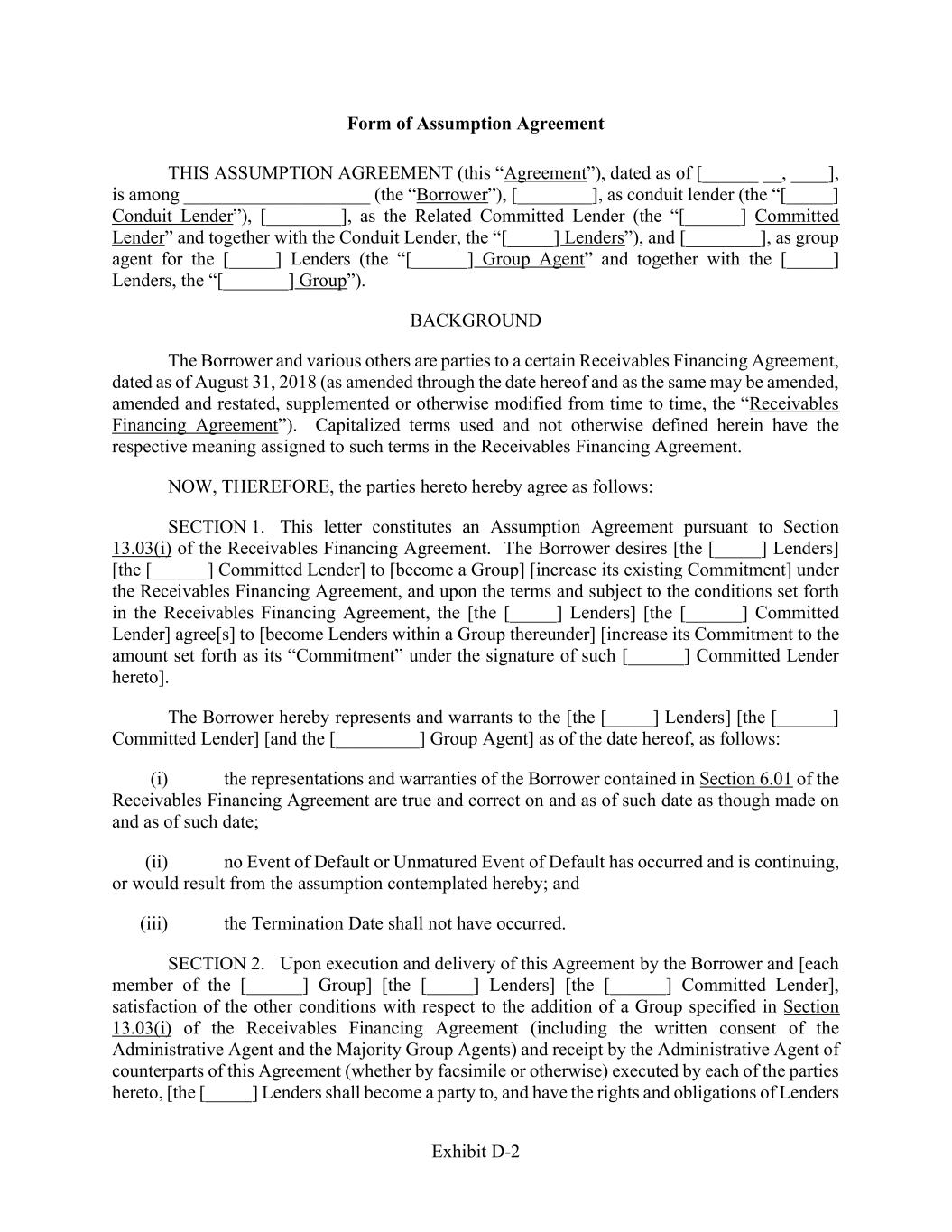 Exhibit D-2 Form of Assumption Agreement THIS ASSUMPTION AGREEMENT (this “Agreement”), dated as of [______ __, ____], is among ____________________ (the “Borrower”), [________], as conduit lender (the “[_____] Conduit Lender”), [________], as the Related Committed Lender (the “[______] Committed Lender” and together with the Conduit Lender, the “[_____] Lenders”), and [________], as group agent for the [_____] Lenders (the “[______] Group Agent” and together with the [_____] Lenders, the “[_______] Group”). BACKGROUND The Borrower and various others are parties to a certain Receivables Financing Agreement, dated as of August 31, 2018 (as amended through the date hereof and as the same may be amended, amended and restated, supplemented or otherwise modified from time to time, the “Receivables Financing Agreement”). Capitalized terms used and not otherwise defined herein have the respective meaning assigned to such terms in the Receivables Financing Agreement. NOW, THEREFORE, the parties hereto hereby agree as follows: SECTION 1. This letter constitutes an Assumption Agreement pursuant to Section 13.03(i) of the Receivables Financing Agreement. The Borrower desires [the [_____] Lenders] [the [______] Committed Lender] to [become a Group] [increase its existing Commitment] under the Receivables Financing Agreement, and upon the terms and subject to the conditions set forth in the Receivables Financing Agreement, the [the [_____] Lenders] [the [______] Committed Lender] agree[s] to [become Lenders within a Group thereunder] [increase its Commitment to the amount set forth as its “Commitment” under the signature of such [______] Committed Lender hereto]. The Borrower hereby represents and warrants to the [the [_____] Lenders] [the [______] Committed Lender] [and the [_________] Group Agent] as of the date hereof, as follows: (i) the representations and warranties of the Borrower contained in Section 6.01 of the Receivables Financing Agreement are true and correct on and as of such date as though made on and as of such date; (ii) no Event of Default or Unmatured Event of Default has occurred and is continuing, or would result from the assumption contemplated hereby; and (iii) the Termination Date shall not have occurred. SECTION 2. Upon execution and delivery of this Agreement by the Borrower and [each member of the [______] Group] [the [_____] Lenders] [the [______] Committed Lender], satisfaction of the other conditions with respect to the addition of a Group specified in Section 13.03(i) of the Receivables Financing Agreement (including the written consent of the Administrative Agent and the Majority Group Agents) and receipt by the Administrative Agent of counterparts of this Agreement (whether by facsimile or otherwise) executed by each of the parties hereto, [the [_____] Lenders shall become a party to, and have the rights and obligations of Lenders