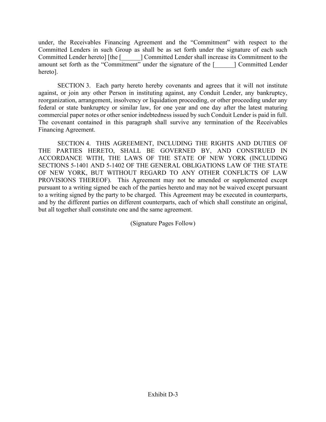 Exhibit D-3 under, the Receivables Financing Agreement and the “Commitment” with respect to the Committed Lenders in such Group as shall be as set forth under the signature of each such Committed Lender hereto] [the [______] Committed Lender shall increase its Commitment to the amount set forth as the “Commitment” under the signature of the [______] Committed Lender hereto]. SECTION 3. Each party hereto hereby covenants and agrees that it will not institute against, or join any other Person in instituting against, any Conduit Lender, any bankruptcy, reorganization, arrangement, insolvency or liquidation proceeding, or other proceeding under any federal or state bankruptcy or similar law, for one year and one day after the latest maturing commercial paper notes or other senior indebtedness issued by such Conduit Lender is paid in full. The covenant contained in this paragraph shall survive any termination of the Receivables Financing Agreement. SECTION 4. THIS AGREEMENT, INCLUDING THE RIGHTS AND DUTIES OF THE PARTIES HERETO, SHALL BE GOVERNED BY, AND CONSTRUED IN ACCORDANCE WITH, THE LAWS OF THE STATE OF NEW YORK (INCLUDING SECTIONS 5-1401 AND 5-1402 OF THE GENERAL OBLIGATIONS LAW OF THE STATE OF NEW YORK, BUT WITHOUT REGARD TO ANY OTHER CONFLICTS OF LAW PROVISIONS THEREOF). This Agreement may not be amended or supplemented except pursuant to a writing signed be each of the parties hereto and may not be waived except pursuant to a writing signed by the party to be charged. This Agreement may be executed in counterparts, and by the different parties on different counterparts, each of which shall constitute an original, but all together shall constitute one and the same agreement. (Signature Pages Follow)