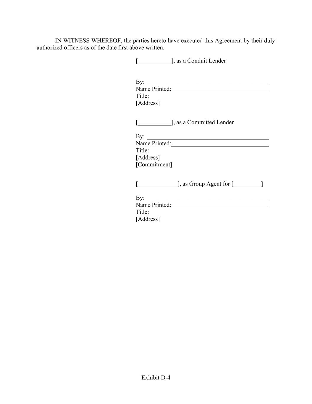 Exhibit D-4 IN WITNESS WHEREOF, the parties hereto have executed this Agreement by their duly authorized officers as of the date first above written. [___________], as a Conduit Lender By: ________________________________________ Name Printed:________________________________ Title: [Address] [___________], as a Committed Lender By: ________________________________________ Name Printed:________________________________ Title: [Address] [Commitment] [_____________], as Group Agent for [_________] By: ________________________________________ Name Printed:________________________________ Title: [Address]