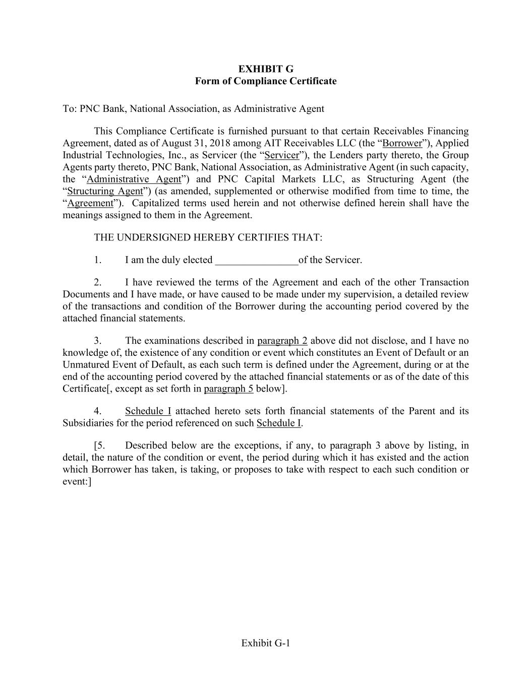 Exhibit G-1 EXHIBIT G Form of Compliance Certificate To: PNC Bank, National Association, as Administrative Agent This Compliance Certificate is furnished pursuant to that certain Receivables Financing Agreement, dated as of August 31, 2018 among AIT Receivables LLC (the “Borrower”), Applied Industrial Technologies, Inc., as Servicer (the “Servicer”), the Lenders party thereto, the Group Agents party thereto, PNC Bank, National Association, as Administrative Agent (in such capacity, the “Administrative Agent”) and PNC Capital Markets LLC, as Structuring Agent (the “Structuring Agent”) (as amended, supplemented or otherwise modified from time to time, the “Agreement”). Capitalized terms used herein and not otherwise defined herein shall have the meanings assigned to them in the Agreement. THE UNDERSIGNED HEREBY CERTIFIES THAT: 1. I am the duly elected ________________of the Servicer. 2. I have reviewed the terms of the Agreement and each of the other Transaction Documents and I have made, or have caused to be made under my supervision, a detailed review of the transactions and condition of the Borrower during the accounting period covered by the attached financial statements. 3. The examinations described in paragraph 2 above did not disclose, and I have no knowledge of, the existence of any condition or event which constitutes an Event of Default or an Unmatured Event of Default, as each such term is defined under the Agreement, during or at the end of the accounting period covered by the attached financial statements or as of the date of this Certificate[, except as set forth in paragraph 5 below]. 4. Schedule I attached hereto sets forth financial statements of the Parent and its Subsidiaries for the period referenced on such Schedule I. [5. Described below are the exceptions, if any, to paragraph 3 above by listing, in detail, the nature of the condition or event, the period during which it has existed and the action which Borrower has taken, is taking, or proposes to take with respect to each such condition or event:]
