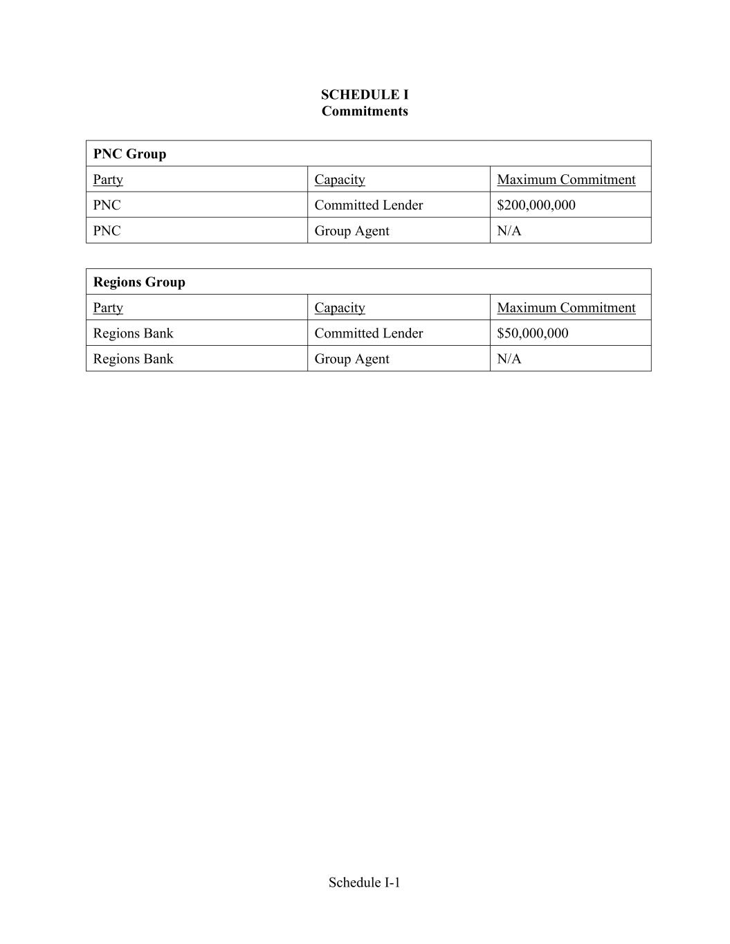 Schedule I-1 SCHEDULE I Commitments PNC Group Party Capacity Maximum Commitment PNC Committed Lender $200,000,000 PNC Group Agent N/A Regions Group Party Capacity Maximum Commitment Regions Bank Committed Lender $50,000,000 Regions Bank Group Agent N/A