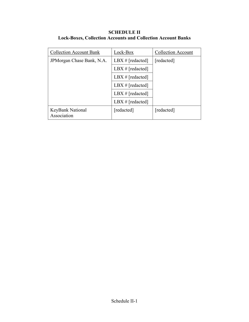 Schedule II-1 SCHEDULE II Lock-Boxes, Collection Accounts and Collection Account Banks Collection Account Bank Lock-Box Collection Account JPMorgan Chase Bank, N.A. LBX # [redacted] [redacted] LBX # [redacted] LBX # [redacted] LBX # [redacted] LBX # [redacted] LBX # [redacted] KeyBank National Association [redacted] [redacted]