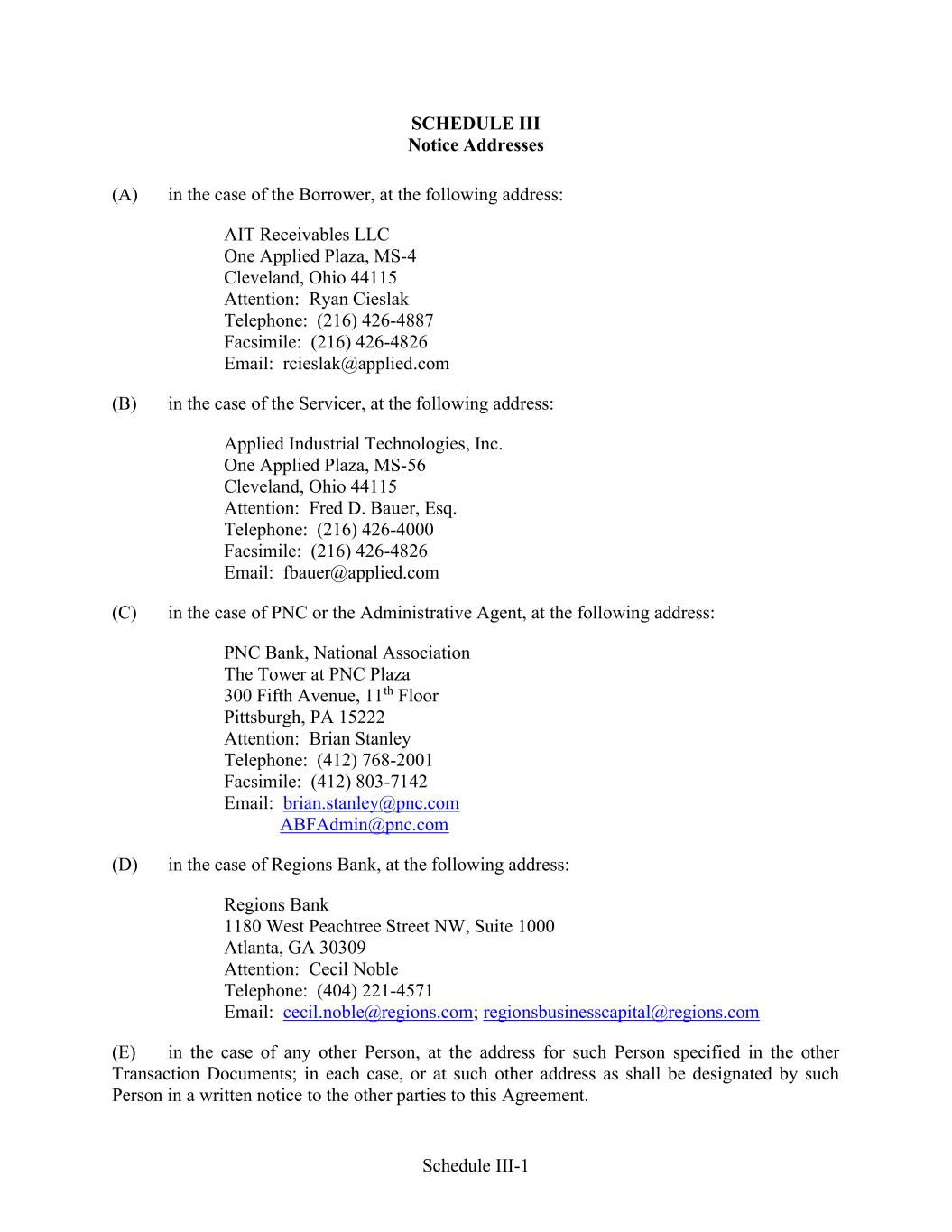 Schedule III-1 SCHEDULE III Notice Addresses (A) in the case of the Borrower, at the following address: AIT Receivables LLC One Applied Plaza, MS-4 Cleveland, Ohio 44115 Attention: Ryan Cieslak Telephone: (216) 426-4887 Facsimile: (216) 426-4826 Email: rcieslak@applied.com (B) in the case of the Servicer, at the following address: Applied Industrial Technologies, Inc. One Applied Plaza, MS-56 Cleveland, Ohio 44115 Attention: Fred D. Bauer, Esq. Telephone: (216) 426-4000 Facsimile: (216) 426-4826 Email: fbauer@applied.com (C) in the case of PNC or the Administrative Agent, at the following address: PNC Bank, National Association The Tower at PNC Plaza 300 Fifth Avenue, 11th Floor Pittsburgh, PA 15222 Attention: Brian Stanley Telephone: (412) 768-2001 Facsimile: (412) 803-7142 Email: brian.stanley@pnc.com ABFAdmin@pnc.com (D) in the case of Regions Bank, at the following address: Regions Bank 1180 West Peachtree Street NW, Suite 1000 Atlanta, GA 30309 Attention: Cecil Noble Telephone: (404) 221-4571 Email: cecil.noble@regions.com; regionsbusinesscapital@regions.com (E) in the case of any other Person, at the address for such Person specified in the other Transaction Documents; in each case, or at such other address as shall be designated by such Person in a written notice to the other parties to this Agreement.