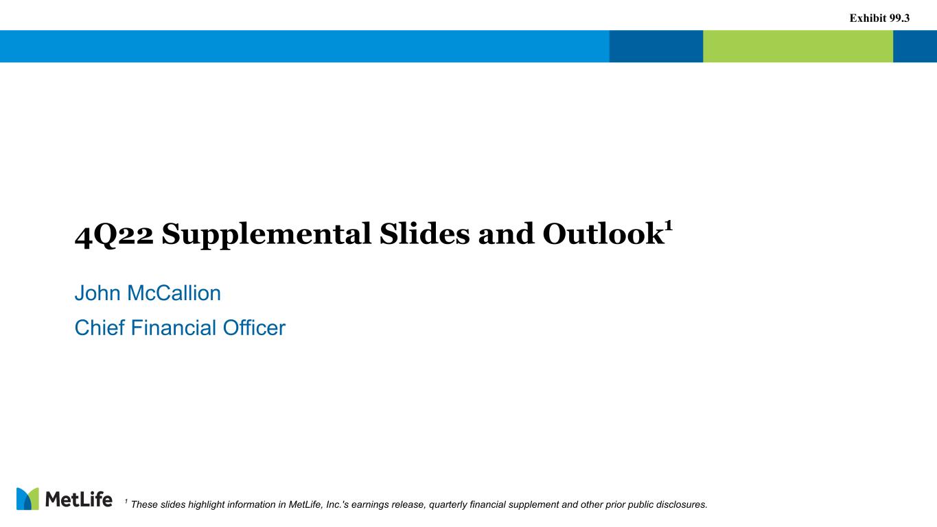 4Q22 Supplemental Slides and Outlook1 John McCallion Chief Financial Officer Exhibit 99.3 1 These slides highlight information in MetLife, Inc.'s earnings release, quarterly financial supplement and other prior public disclosures.